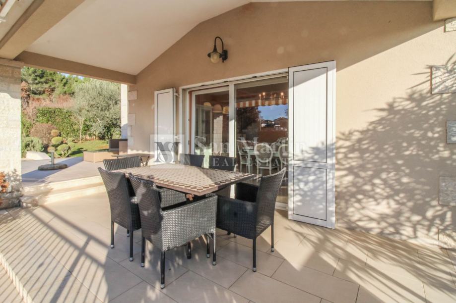U njegovanoj okućnici nalaze se privatan bazen, prostrano sunčalište i lijepo održavan vrt koji stvara autentičnu mediteransku atmosferu. Cijela je parcela osmišljena tako da pruža maksimalnu privatnost i predstavlja savršen prostor za opuštanje i uživanje na otvorenom.