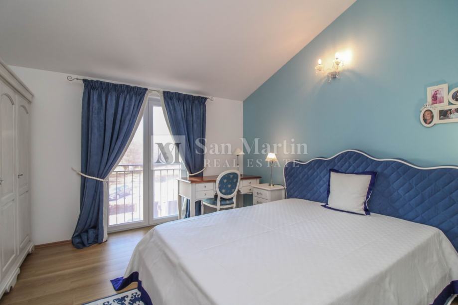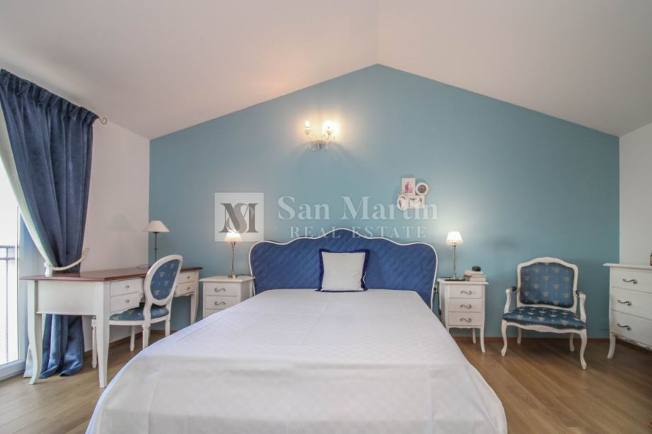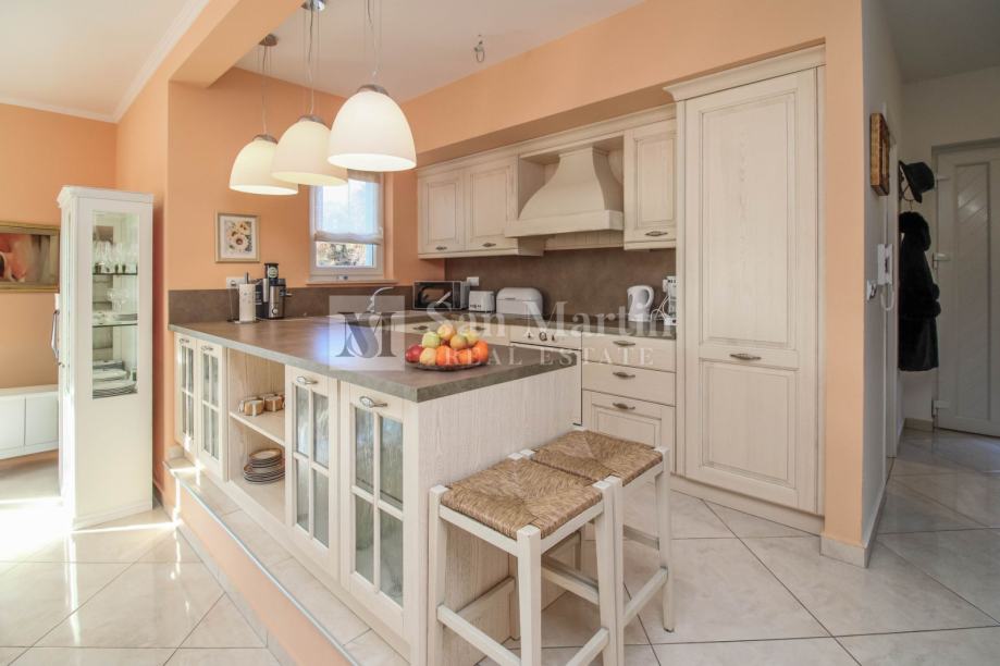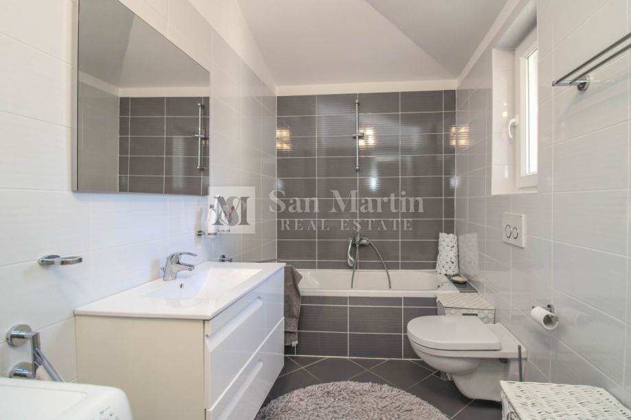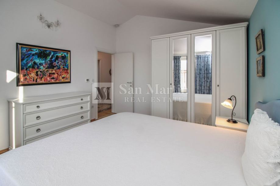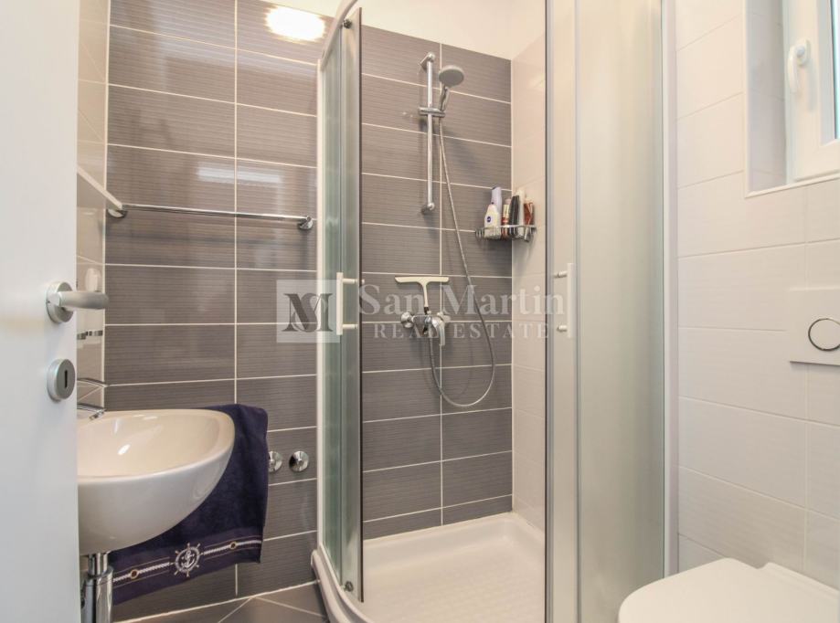U prizemlju se nalazi prostrani ulazni hodnik koji vodi do potpuno opremljene kuhinje povezane s blagovaonicom, iz koje se izlazi na natkrivenu terasu – savršeno mjesto za ljetna druženja i uživanje u obrocima na otvorenom. Tu su i komforan dnevni boravak, praktična ostava te moderna kupaonica s tušem. Na katu se nalaze tri udobne spavaće sobe i elegantna kupaonica s kadom, a s gornje etaže pruža se predivan pogled na more, što prostoru daje dodatnu vrijednost i šarm.