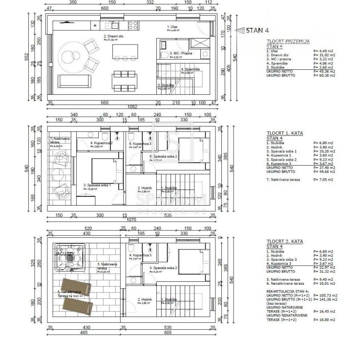 Unutarnje stubište vodi na prvi kat, gdje se nalaze dvije spavaće sobe, svaka s vlastitom kupaonicom i natkrivena terasa tlocrtne površine 7 m2. Na drugom katu nalazi se treća spavaća soba, kupaonica i djelomično natkrivena terasa s prekrasnim pogledom na more.