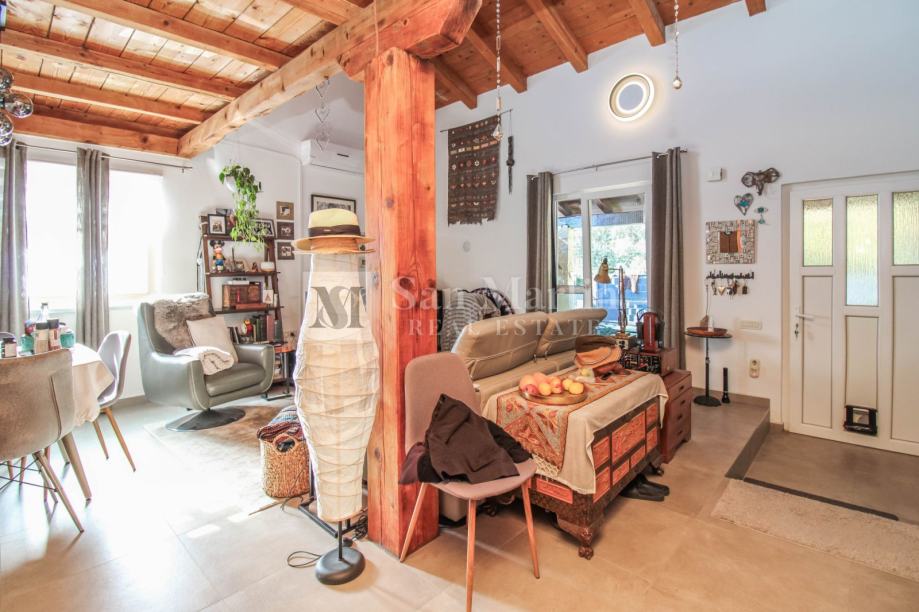 • Prostran dnevni boravak i blagovaonica (43 m²) s visokim stropovima, drvenim gredama i kaminom na drva – savršeno mjesto za obiteljska druženja