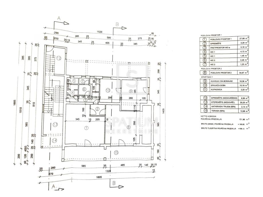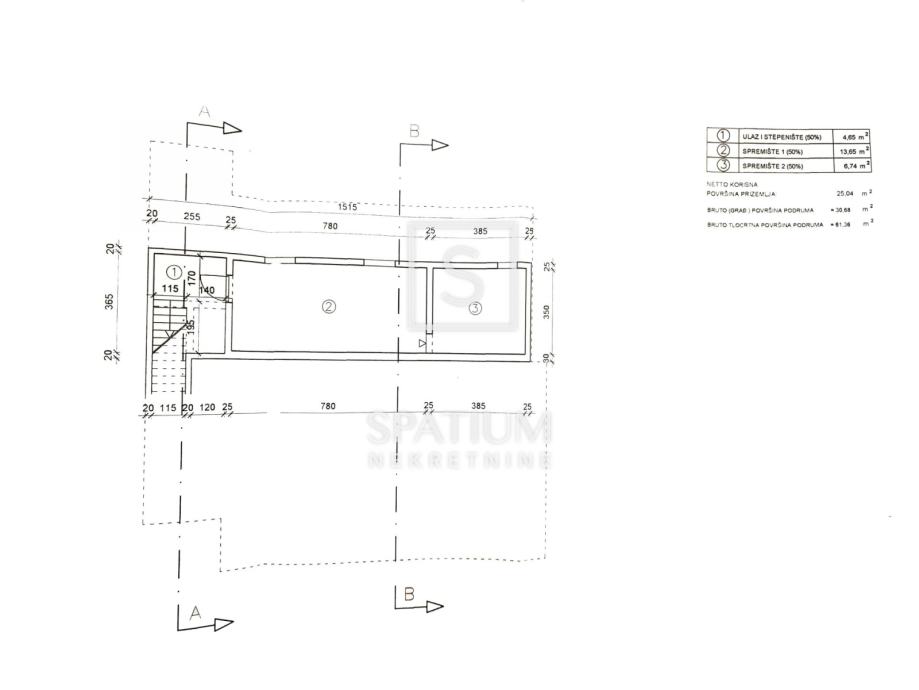 Prizemlje se sastoji od uređenog apartmana s dvije spavaće sobe, kupaonicom i kuhinjom, kao i dvije poslovne jedinice ukupne površine cca 90 m², idealne za razne djelatnosti.