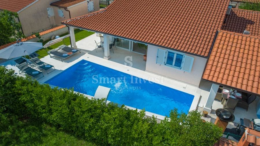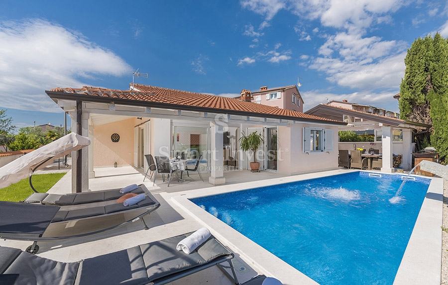 Na prodaju je kvalitetno izgrađena kuća prizemnica s grijanim bazenom, smještena u lijepom uređenom naselju nadomak grada Poreča, u okruženju obiteljskih kuća i kuća za odmor. Lokacija koja je samo cca 7 km udaljena od centra Poreča, nudi idealnu ravnotežu između mira, prirode i blizine svih važnih sadržaja.