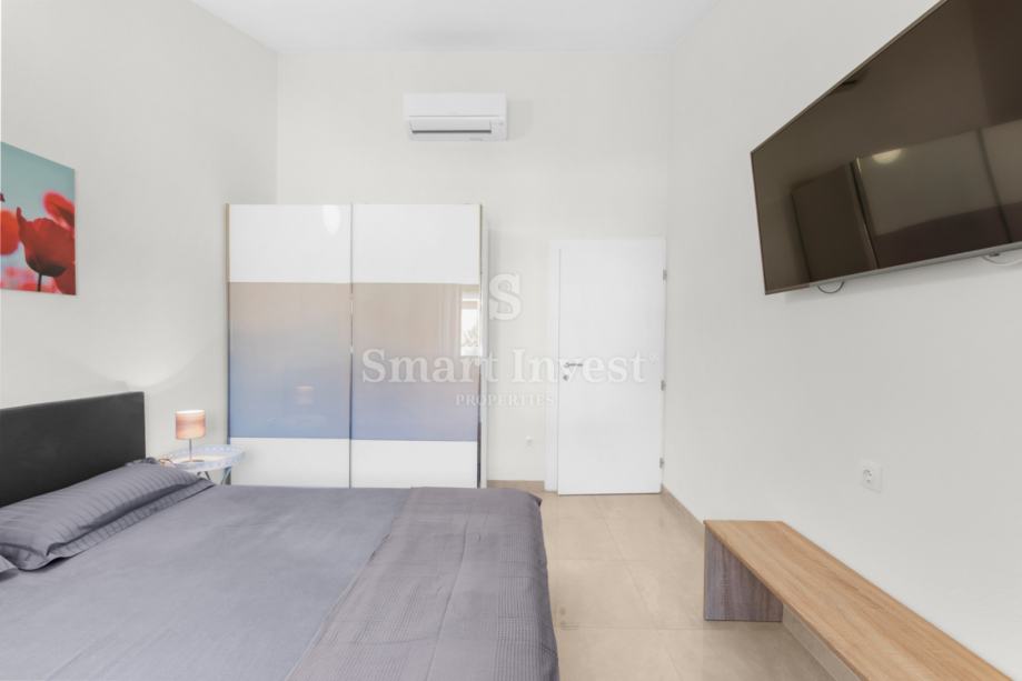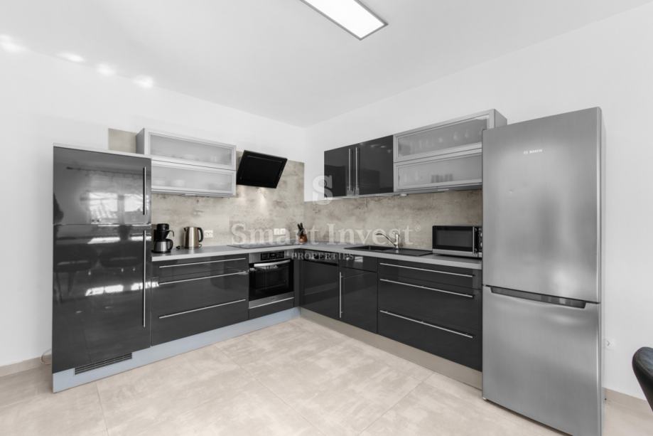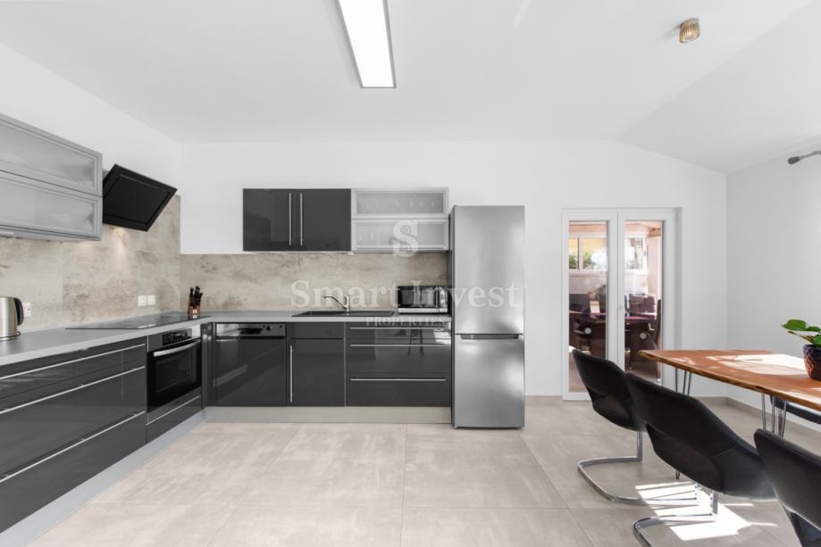 Prizemnica je ukupne stambene površine 136 m² nudi dnevni boravak s blagovaonicom i kuhinjom, povezan s natkrivenom terasom na kojoj se nalazi ljetna kuhinja – idealna za boravak tijekom ljetnih mjeseci. Također, iz centralnog dijela kuće se pruža pogled na bazen kroz široke klizne staklene stijene. Kuća ima tri prostrane spavaće sobe, te tri moderno uređene kupaonice i zasebnu tehničku prostoriju.