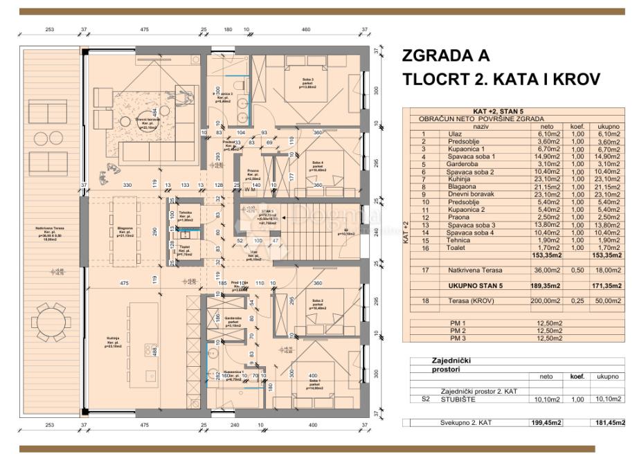 Stanu pripada i krovna terasa od 200m2 te 3 parkirna mjesta.