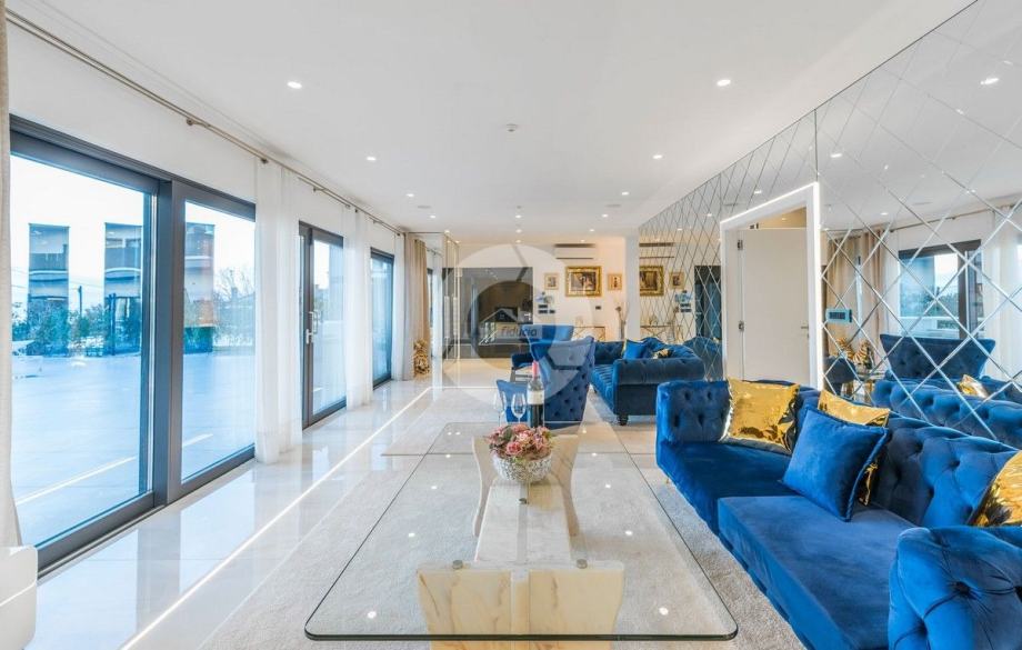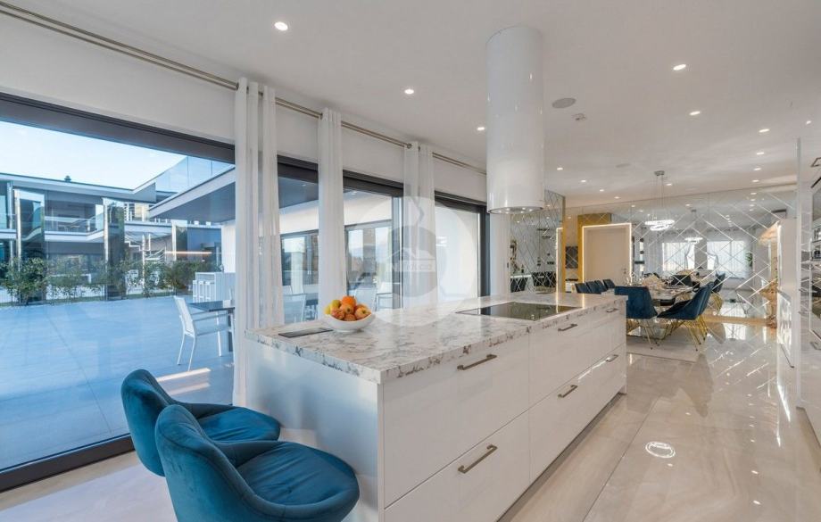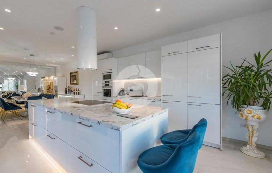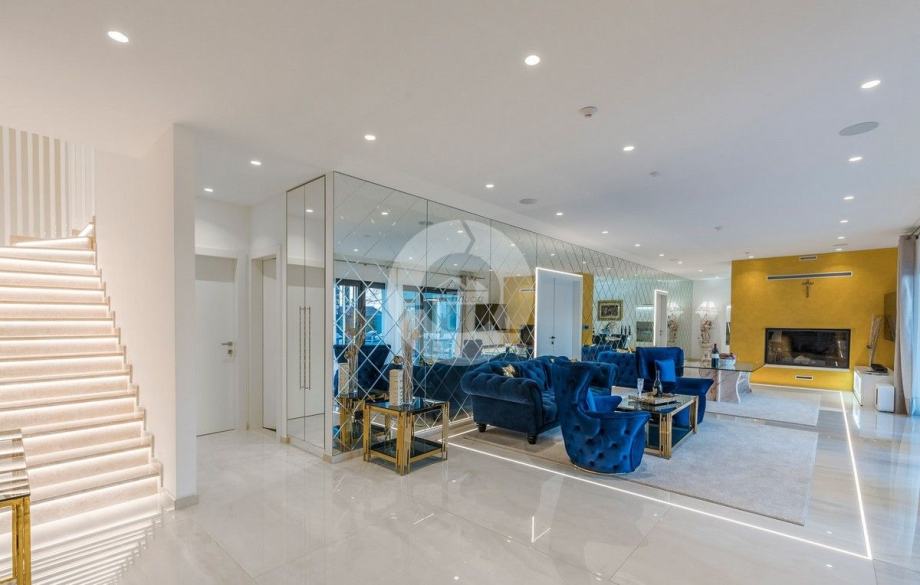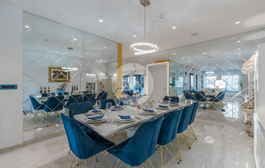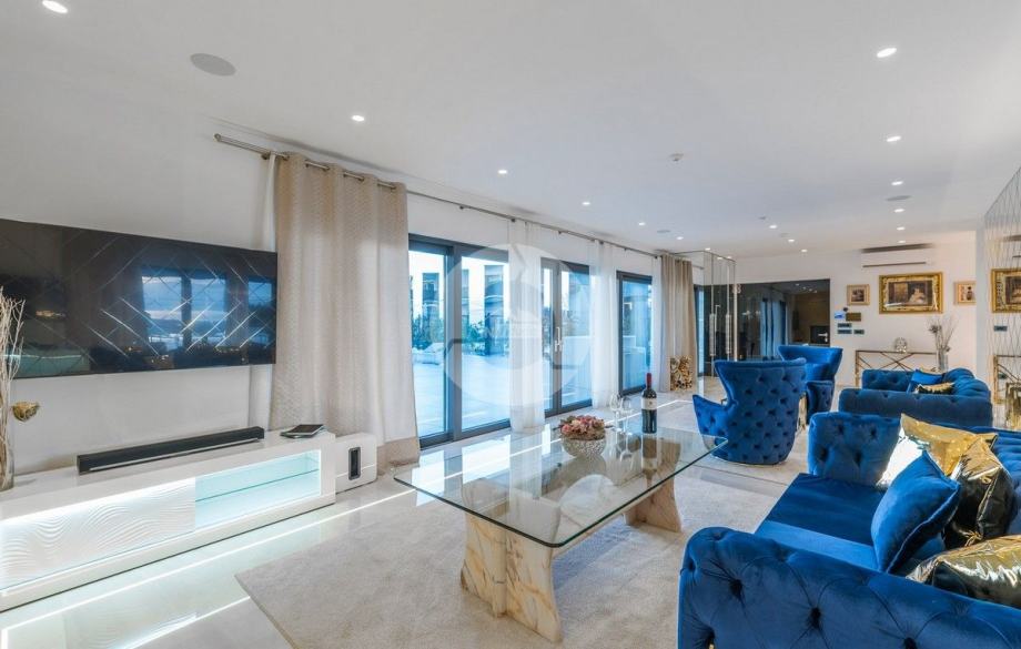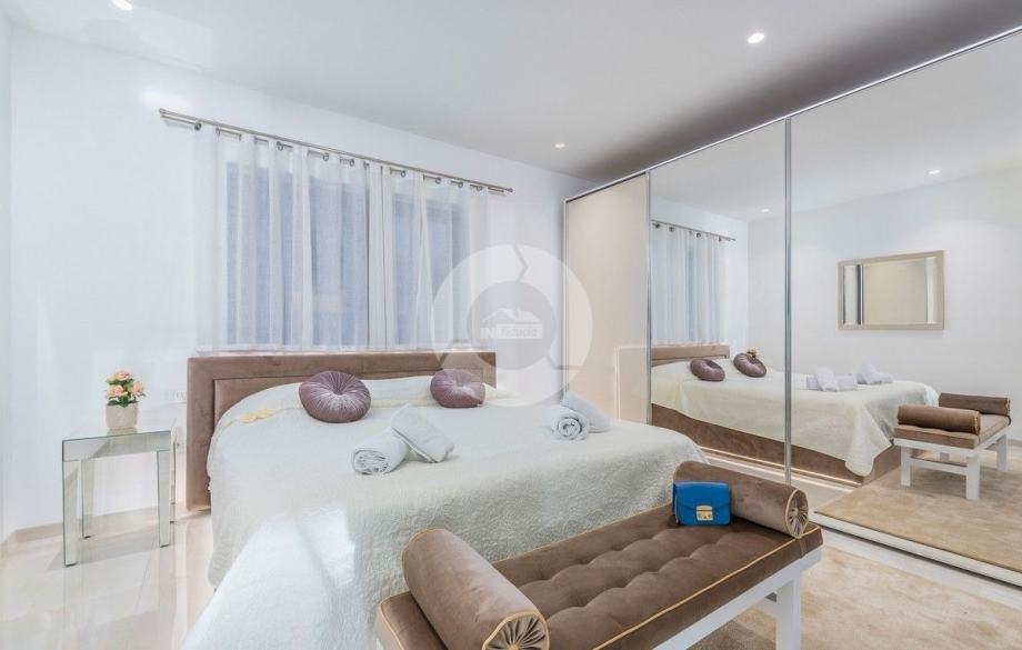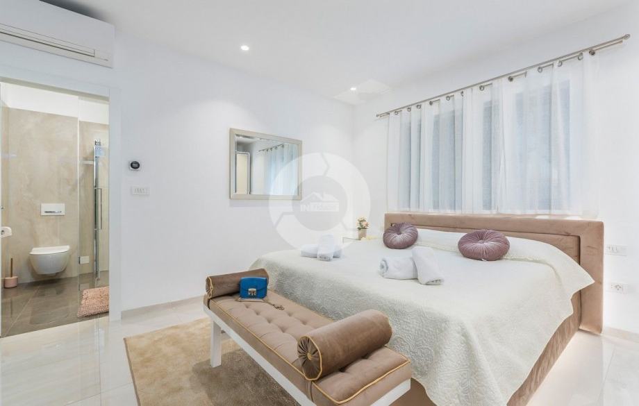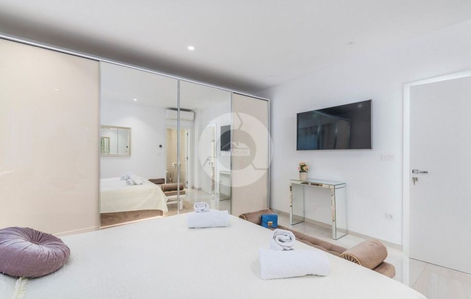 Sa svojih 400 m2, može smjestiti 10 ljudi u 5 spavaćih soba. 2 sobe nalaze se u prizemlju, opremljene sa King size krevetima, TV-om, Walk-in ormarom 3 spavaće sobe na katu s kojeg imate predivan pogled na more, i možete pristupiti bazenu i vrtu s odvojenim stepenicama. Tamo su 4 walk-in kupaonice, jedna u prizemlju i 3 na gornjem katu. U prizemlju se nalazi kompletno opremljena kuhinja i blagovaonica, i luksuzno uređen dnevni boravak podijeljen na dnevni boravak s kutnom garniturom i fotelje, i lijep bar s vinotekom, pogodno za večernja druženja. U vrtu se nalazi prekrasni mozaik bazen (11×6) okružen ležaljkama i potpuno ograđen ogradom i zelenilom.