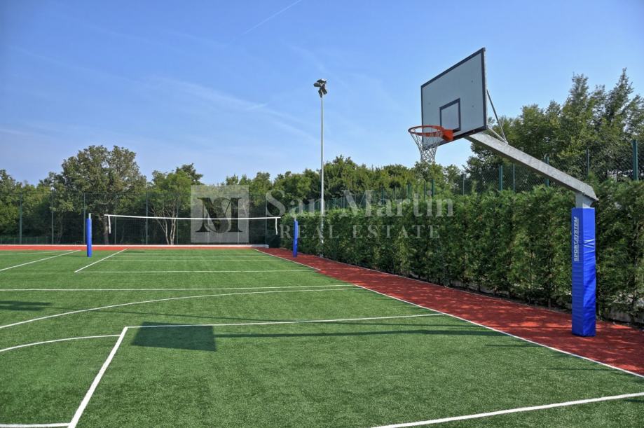U vlasništvu kuće i dio ograđenog i zatvorenog sportsko rekreacijskog kompleksa, koji se sastoji od ekološkog vrta, uređenog dječjeg igrališta, teniskog terena, terena za boćanje, terena za rukomet i košarku, terena za odbojku i fitnesa na otvorenom. Svi tereni imaju rasvjetu tako da se mogu koristi i noću.