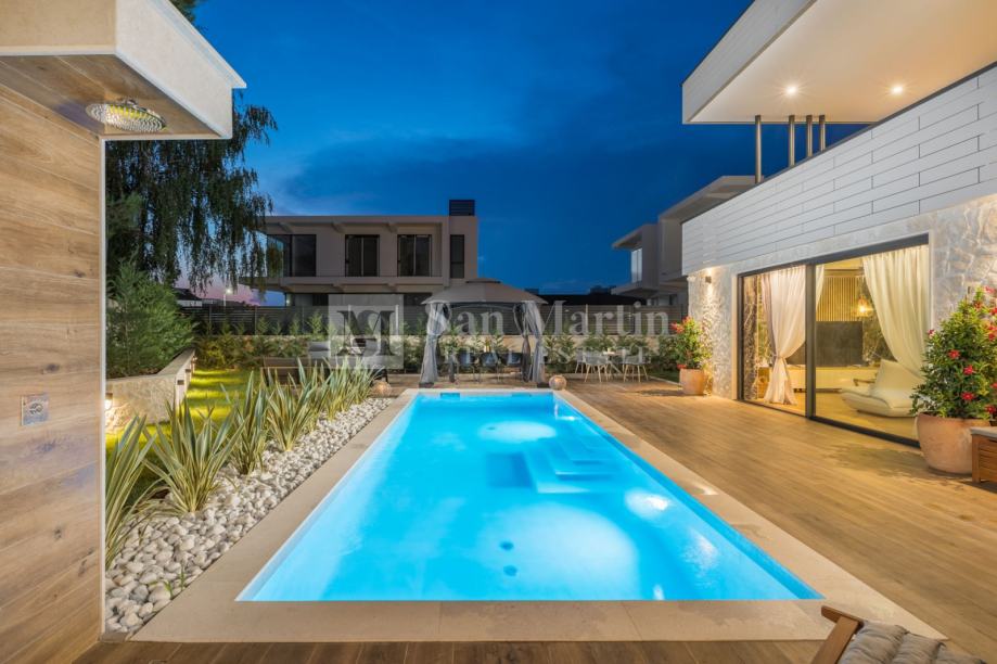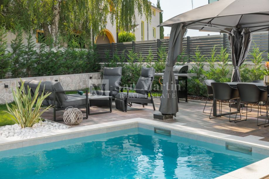 Kuća je okružena lijepo uređenim vrtom u kojem se nalazi grijani bazen sa zonom za sunčanje.
