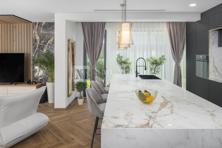 U mjestu sa svim potrebnim sadržajem na prodaju je prekrasna moderna kuća koja se smjestila na okućnici od 620 m2 te njena ukupna površina iznosi 180 m2. Kuća se prostire na dvije etaže i sastoji se od dnevnog boravka, kuhinje i blagovaone otvorenog koncepta, dvije spavaće soba sa vlastitim kupaonama u prizemlju te još tri spavaće sobe sa vlastitim kupaonama na katu.