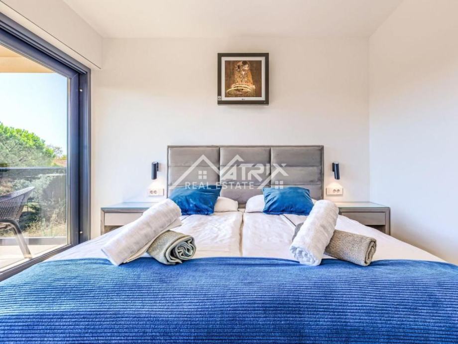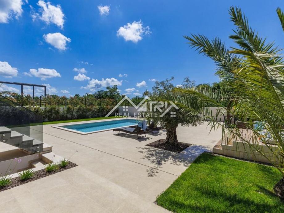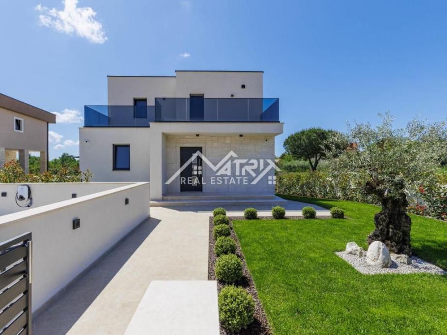 Na svega 2 km udaljenosti od mora i nekoliko minuta vožnje od centra Poreča, smjestila se ova elegantna nova vila, neto površine 217,43 m². Okružena zelenilom i šumom, vila pruža potpuni mir i privatnost, a istovremeno blizinu svih potrebnih sadržaja.