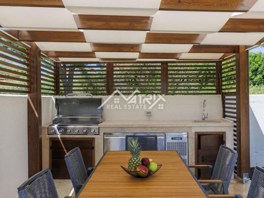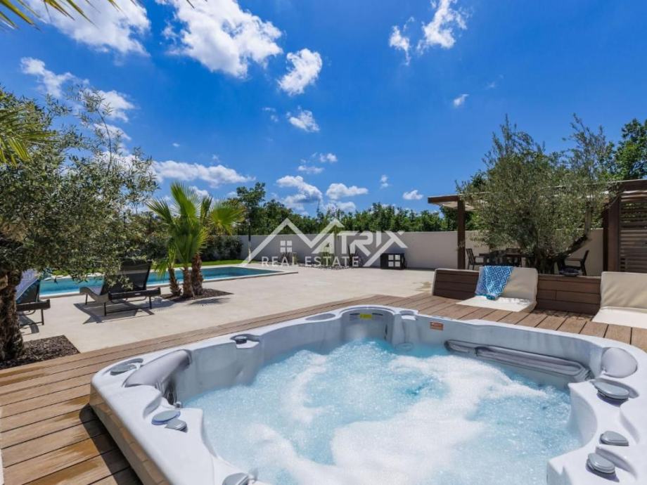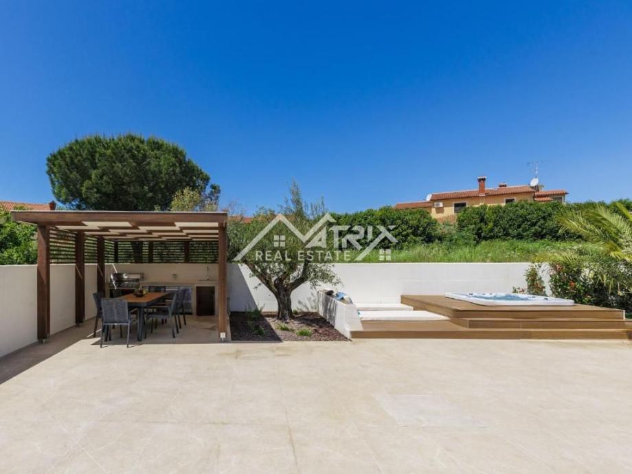 Iz dnevnog boravka i kuhinje izlazi se na prostranu natkrivenu terasu i uređenu okućnicu. U vanjskom dijelu nalazi se veliki grijani bazen s vlastitom dizalicom topline, jacuzzi te natkrivena ljetna kuhinja s roštiljem, sudoperom i hladnjakom – idealno za uživanje na otvorenom tijekom cijele godine.