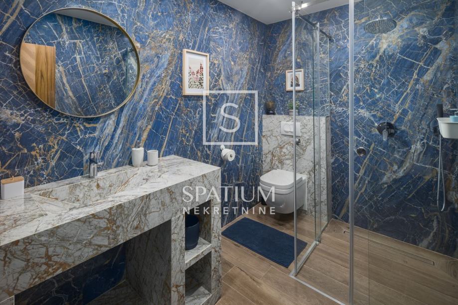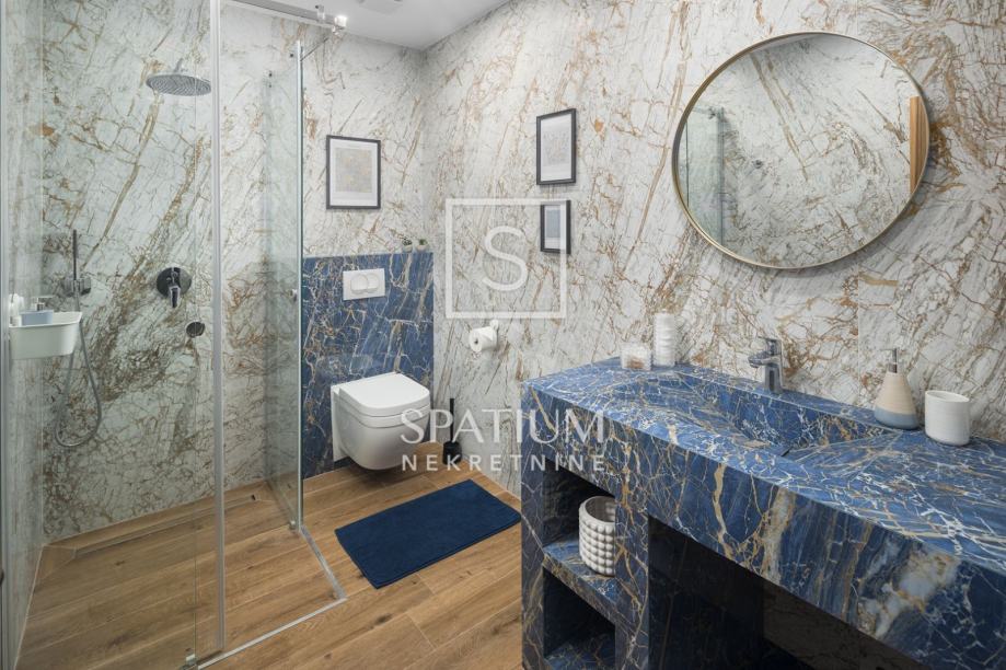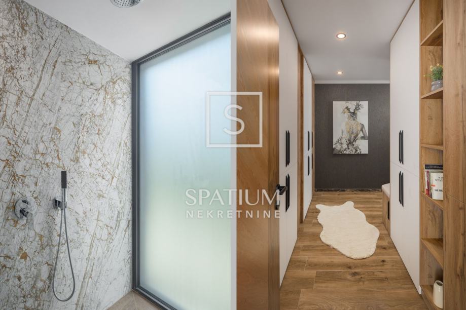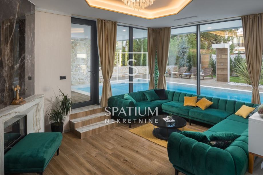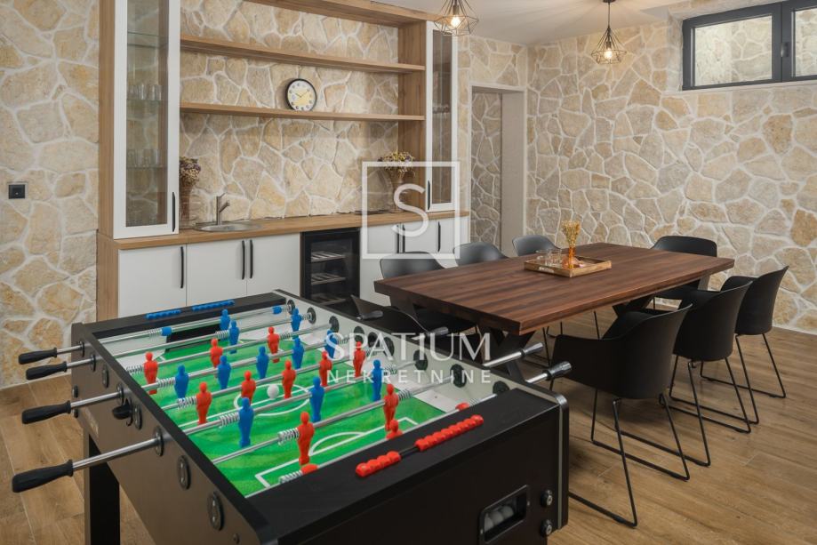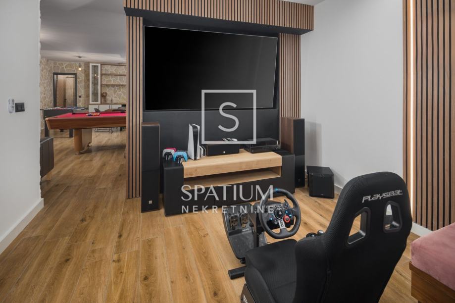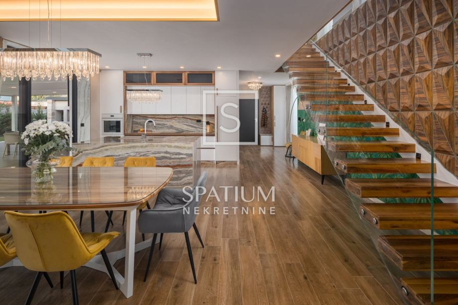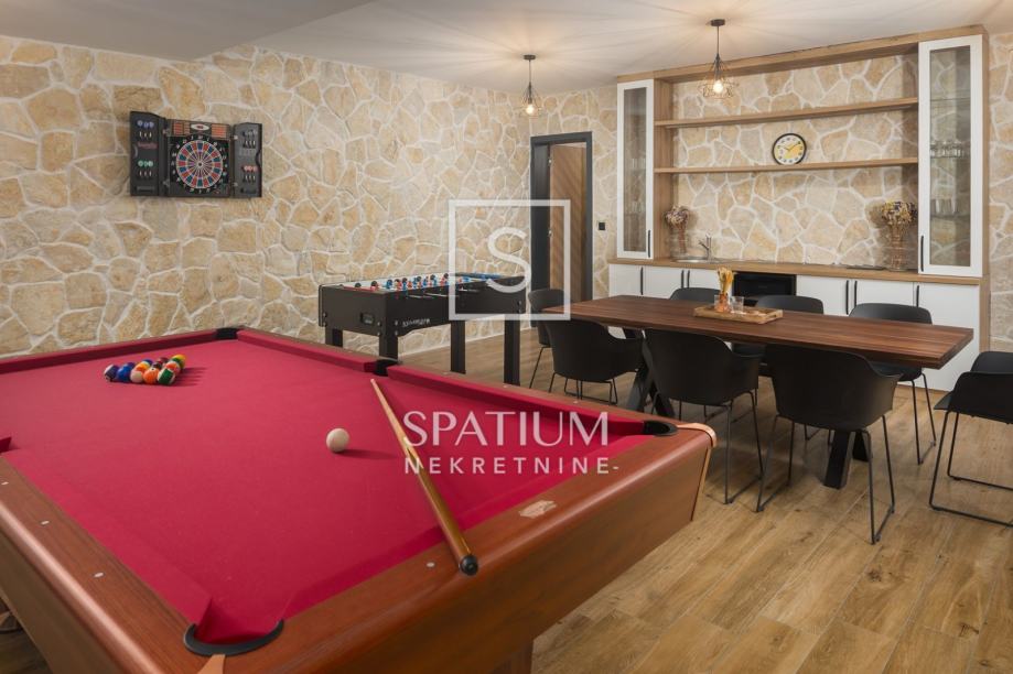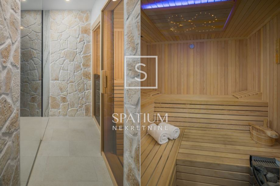 POREČ, FUNTANA, u ponudi je ekskluzivna vila smještena je na zemljištu od 750 m² i nudi 320 m² pažljivo dizajniranog interijera raspoređenog na tri etaže. U prizemlju se nalazi prostrani open space dnevni boravak s modernom kuhinjom i blagovaonicom, elegantno upotpunjen kaminom i gostinjskim toaletom. Na prvom katu nalaze se četiri spavaće sobe, svaka s vlastitom kupaonicom i izlazom na terasu s pogledom na more, dok krovna terasa pruža panoramski pogled na okolicu. Podrum uključuje biljar, kućno kino i prostor za opuštanje. Okućnica je pomno uređena i obogaćena grijanim bazenom, hidromasažnom kadom, natkrivenim prostorom za druženje i privatnim parkiralištem. Dodatni sadržaji, poput podnog grijanja, klima uređaja u svim prostorijama, solarnih panela, video nadzora i saune, osiguravaju maksimalnu udobnost i sigurnost tijekom cijele godine.
