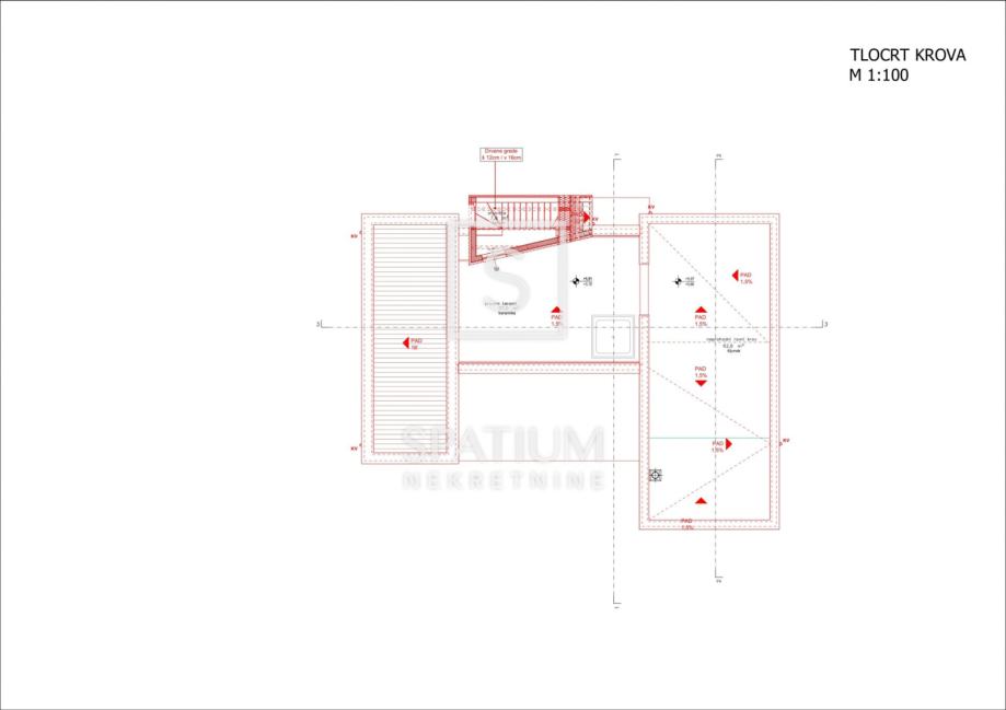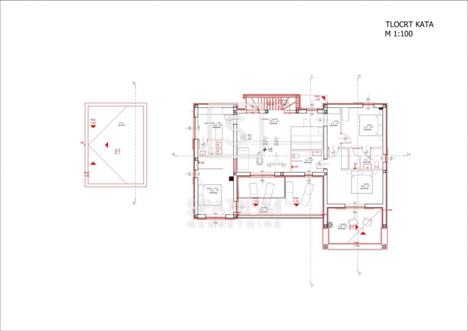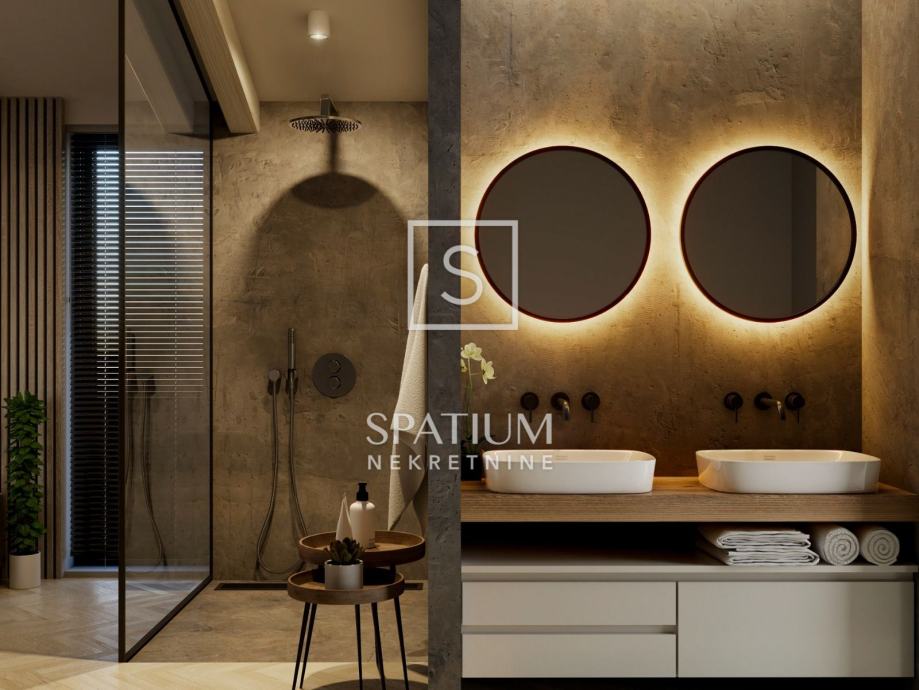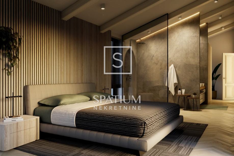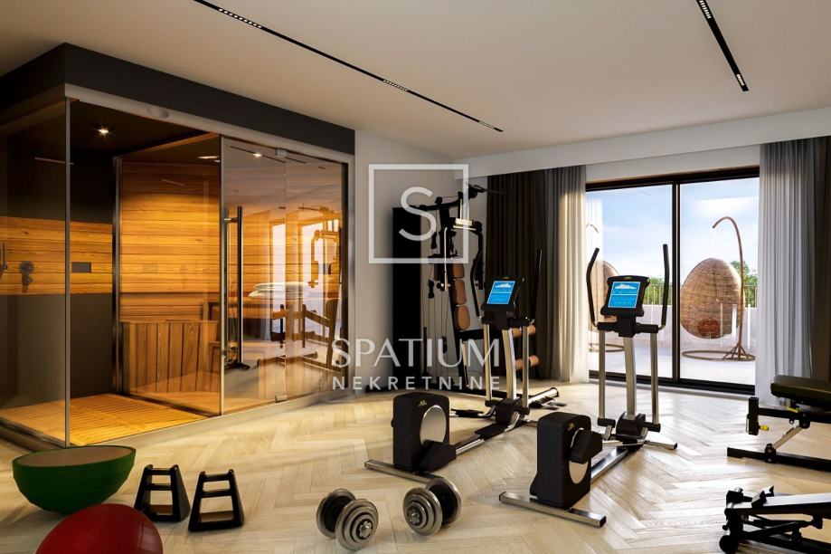 Unutarnje stubište vodi na prvi kat gdje centralno mjesto zauzima moderna teretana s integriranom saunom, idealna za opuštanje i rekreaciju. Oko teretane smještene su tri prostrane spavaće sobe, svaka s vlastitom kupaonicom. Ova etaža dodatno je obogaćena balkonom i natkrivenom loggiom, savršenim mjestima za jutarnju kavu ili mirne večeri. Krovna terasa, do koje se dolazi vanjskim stubištem, prostire se na 37 m² i zamišljena je kao prava oaza uživanja. Ovdje će biti postavljena hidromasažna kada, s pogledom na okolni krajolik koji oduzima dah.