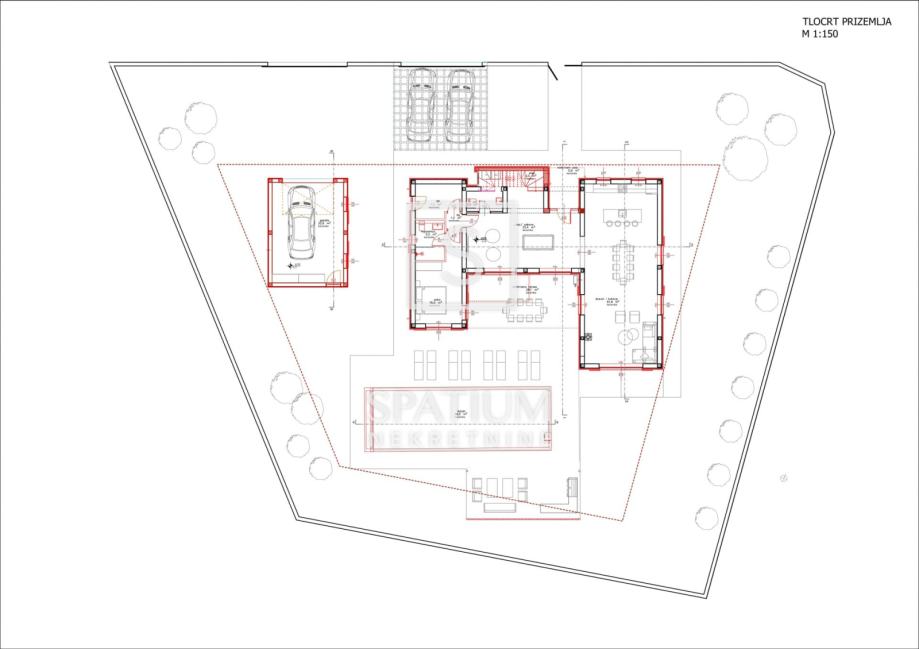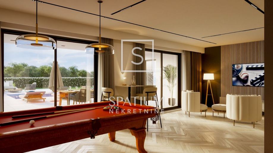 Prizemlje vile sastoji se od ulaznog hodnika koji vodi u prostrani prostor za druženje, opremljen velikim biljarskim stolom. Na desnoj strani nalazi se spavaća soba koja ima vlastitu kupaonicu, dok su spremište, kotlovnica i WC za goste također praktično smješteni na ovoj etaži. Lijevi dio prizemlja dominira otvoreni prostor kuhinje i dnevnog boravka, ukupne površine 62 m², koji se elegantno spaja s natkrivenom terasom, pružajući savršen prostor za opuštanje i uživanje.
