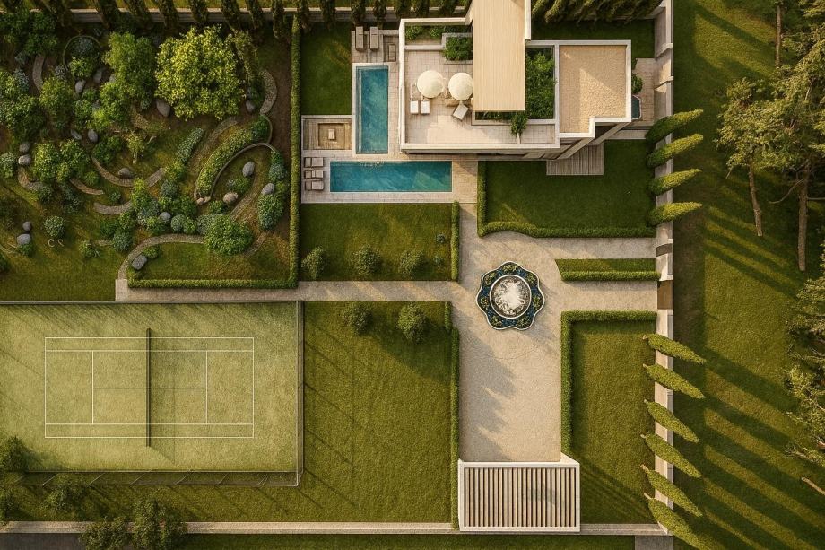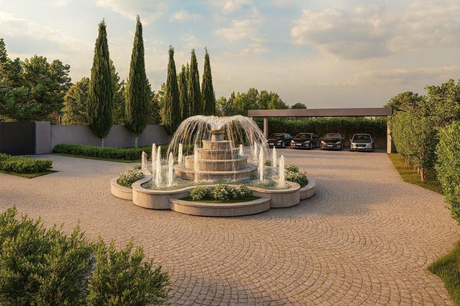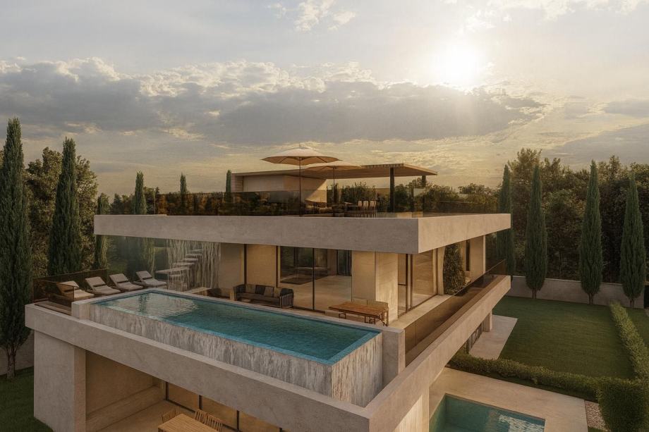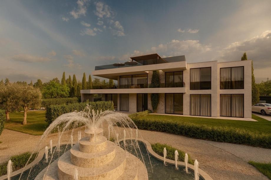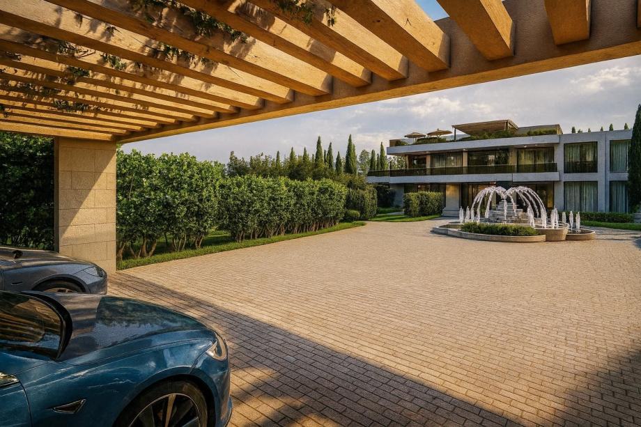 S parcele se pruža očaravajući pogled na more, dok sama vila ima parking za više od 5 automobila, uključujući kružni tok za lakšu cirkulaciju vozila.U središtu parkinga nalazi se raskošna fontana koja dodatno naglašava eleganciju posjeda.Vila se može pohvaliti s dva bazena – gornji infinity bazen sa slapom na prvom katu obložen visoko kvalitetnim mramornim pločama, donji bazen u prizemlju sa predivnim slapom , stvarajući vizualno zapanjujući efekt.Privatni golf i teniski teren opremljeni su sustavom automatskog navodnjavanja, pružajući mogućnost aktivnog odmora u svakom trenutku.Krovna terasa: Na krovu vile nalazi se prostrana terasa s natkrivenim dijelom, idealna za opuštanje i uživanje u nezaboravnom pogledu koji obuhvaća Alpe, more i okolnu prirodu. Ova terasa savršeno je mjesto za večernja druženja uz zalazak sunca.
