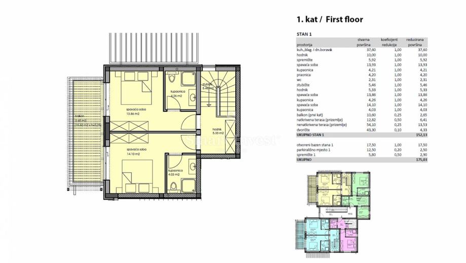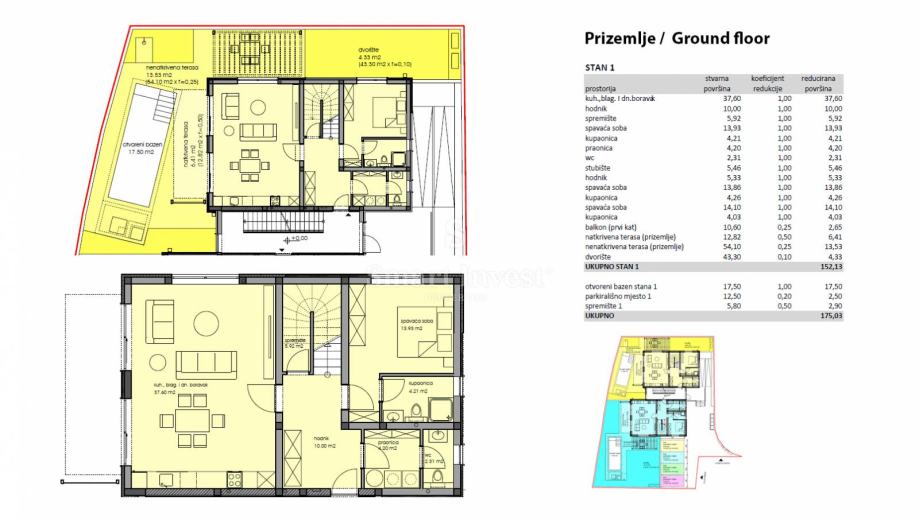 STAN S1 – neto korisne površine 152.13 m2 smješten je u prizemlju i na 1. katu, ima 3 spavaće sobe, 3 kupaonice + 1 WC.
