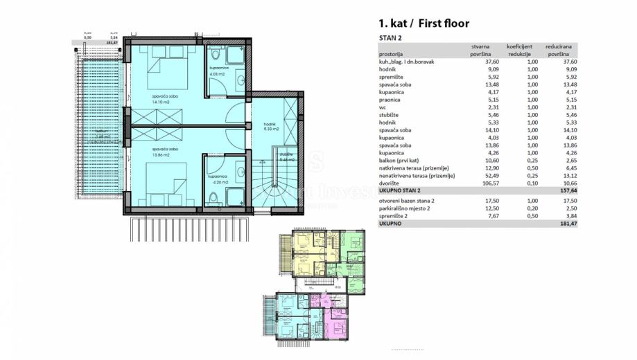 STAN S2 – neto korisne površine 157.64 m2 smješten je u prizemlju i na 1. katu, ima 3 spavaće sobe, 3 kupaonice + 1 WC.