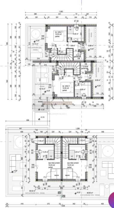 Prvi kat – predsoblje, dvije spavaće sobe (od kojih jedna ima garderobu i vlastitu kupaonicu), dodatna kupaonica te spremište.