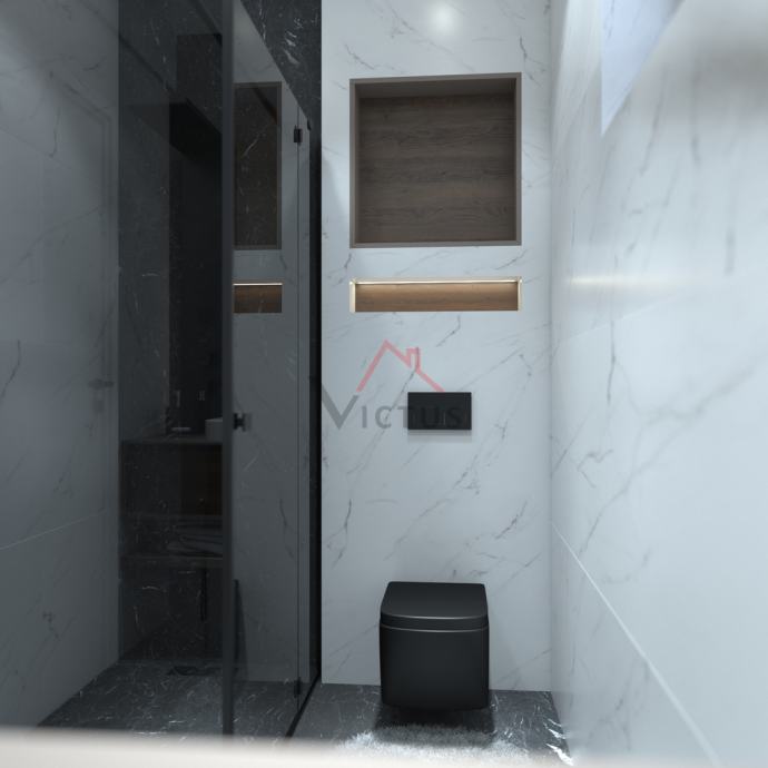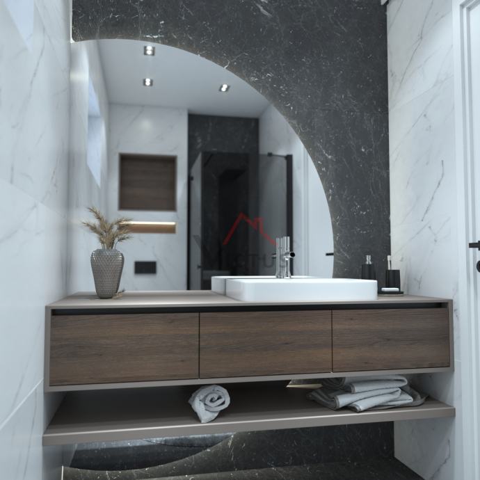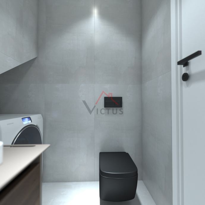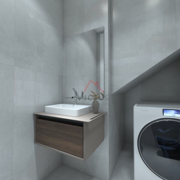 Vrhunske kvalitete izgradnje i opremljenosti, kuća netto površine od 135m2 proteže se na prizemlje i kat sa krovnom terasom, te dvorište površine 111m2.