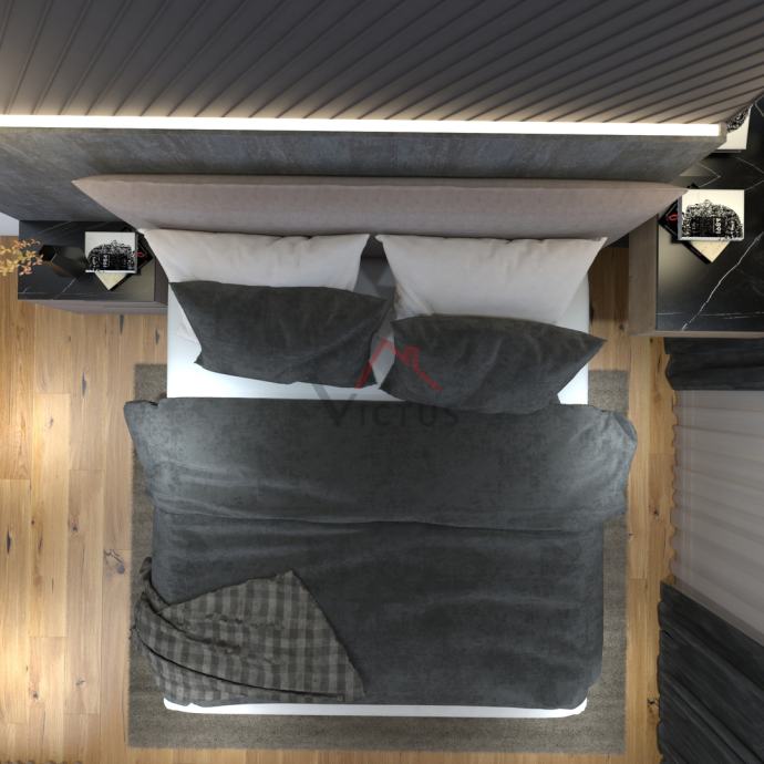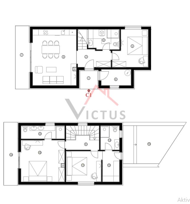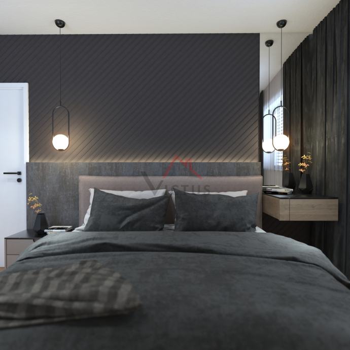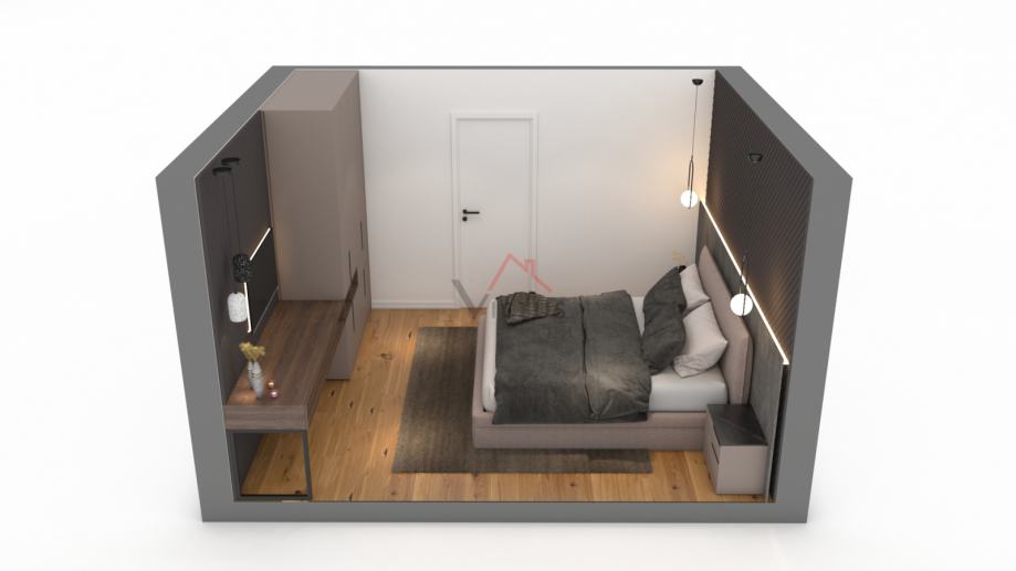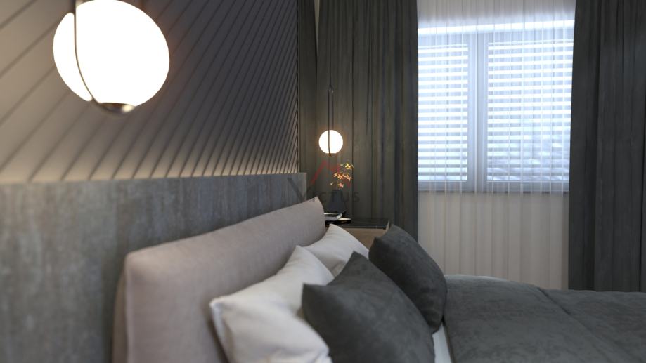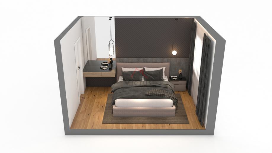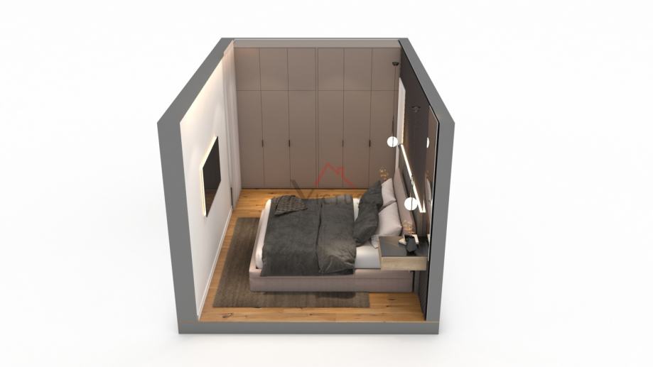 U prizemlju se nalazi ulazni hodnik, dnevni dio, odnosno dnevni boravak, kuhinja i blagovaonica, kupaona, jedna spavaća soba, ostava/spremište i terasa. Na prvome katu se nalaze dvije spavaće sobe, od kojih jedna sa walk-in garderobom, i dvije kupaonice, hodnik te jedna velika terasa.