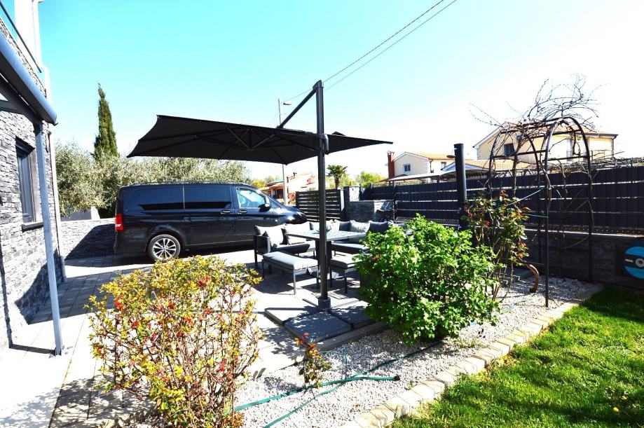 Prodaje se moderno uređena dvojna kuća ukupne površine 83 m², smještena u mirnom i zelenom okruženju nedaleko Poreča i svega nekoliko minuta vožnje od mora. Kuća se nalazi na parceli od 252 m², a iz kuće i s terasa pruža se pogled na more.