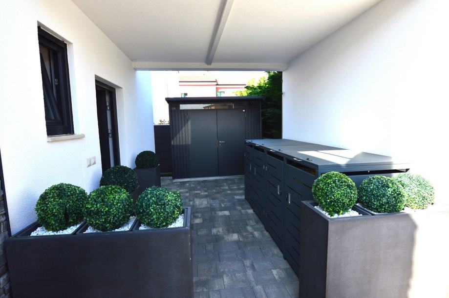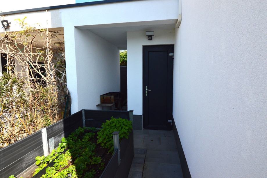 Okućnica je pažljivo uređena, s posađenim stablom masline, raznolikim mediteranskim biljem i cvijećem, idealna za opuštanje i boravak na otvorenom. Uz kuću se nalazi i spremište, te dodatni montažni kontejner koji služi kao dodatni skladišni prostor.