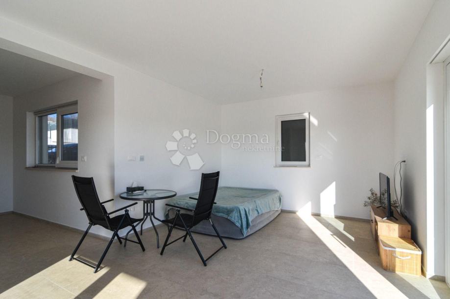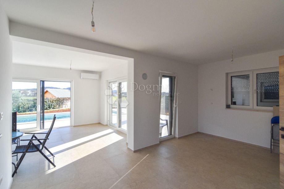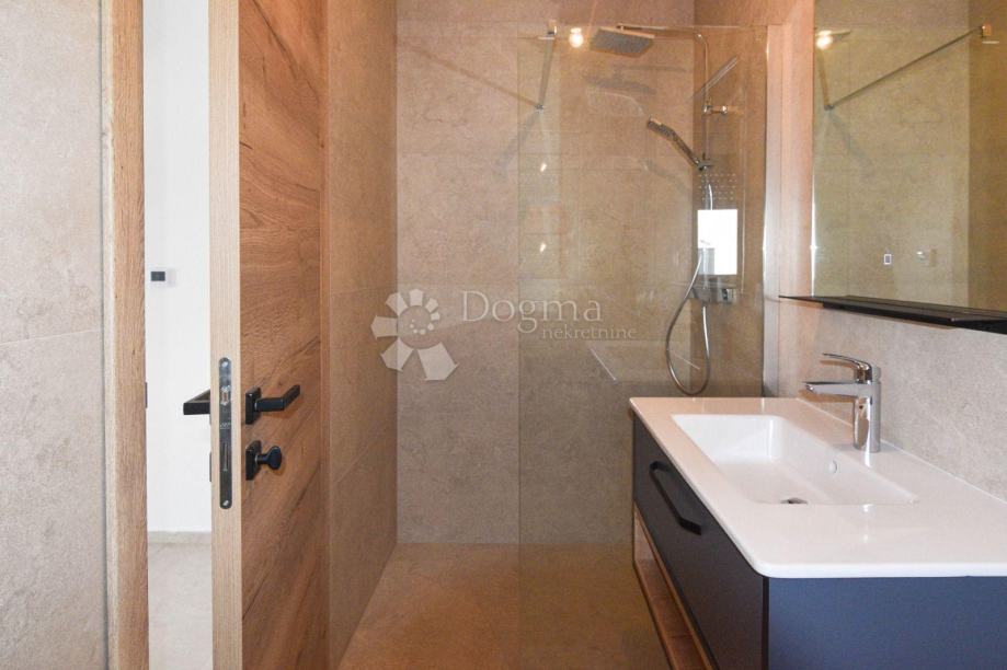 Prizemlje oduševljava prostranim open space konceptom dnevnog boravka, blagovaonice i moderne kuhinje, s izravnim izlazom na natkrivenu terasu i grijani bazen dimenzija 3 x 7 m. Ovaj prostor idealan je za opuštanje i druženje tijekom cijele godine. S desne strane prizemlja nalazi se udobna spavaća soba s vlastitom kupaonicom, dok je dodatno na raspolaganju i zasebni gostinjski WC.