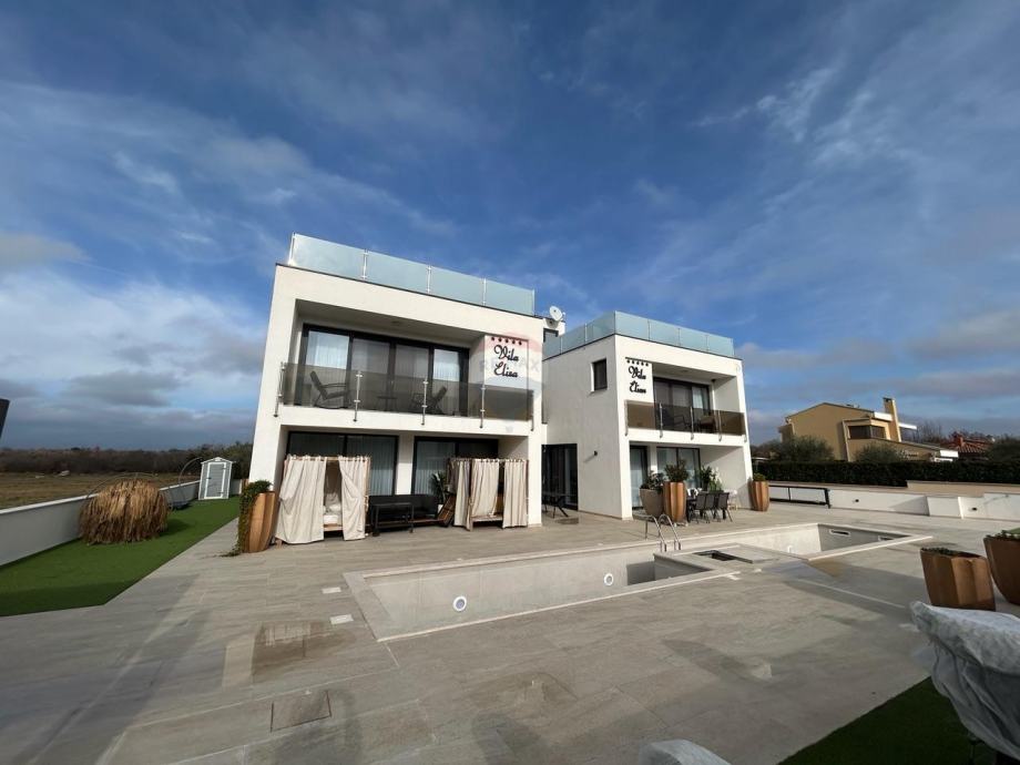 Na prodaju je moderna vila koja se sastoji od dva dijela. Svaki dio se sastoji od prizemlja i kata ukupne površine od 200 m2. Dijelovi su medjusobno odvojeni kuhinjom i vanjskim bazenom sa tušem. Na katovima se nalaze spavaće sobe sa kupaonicama.