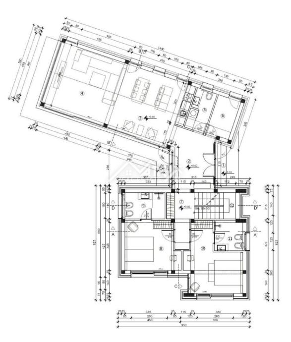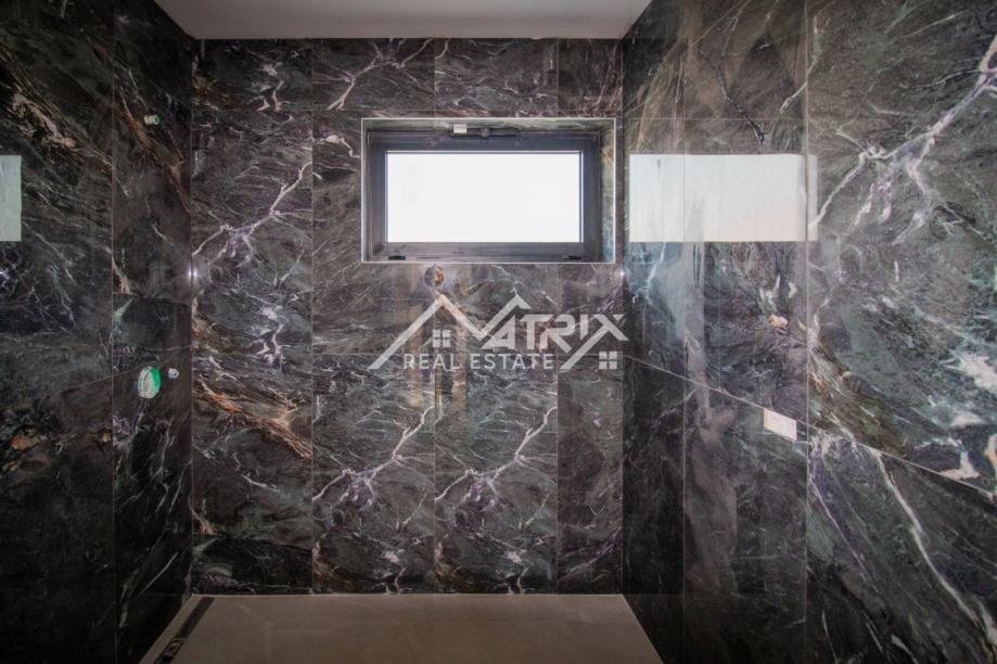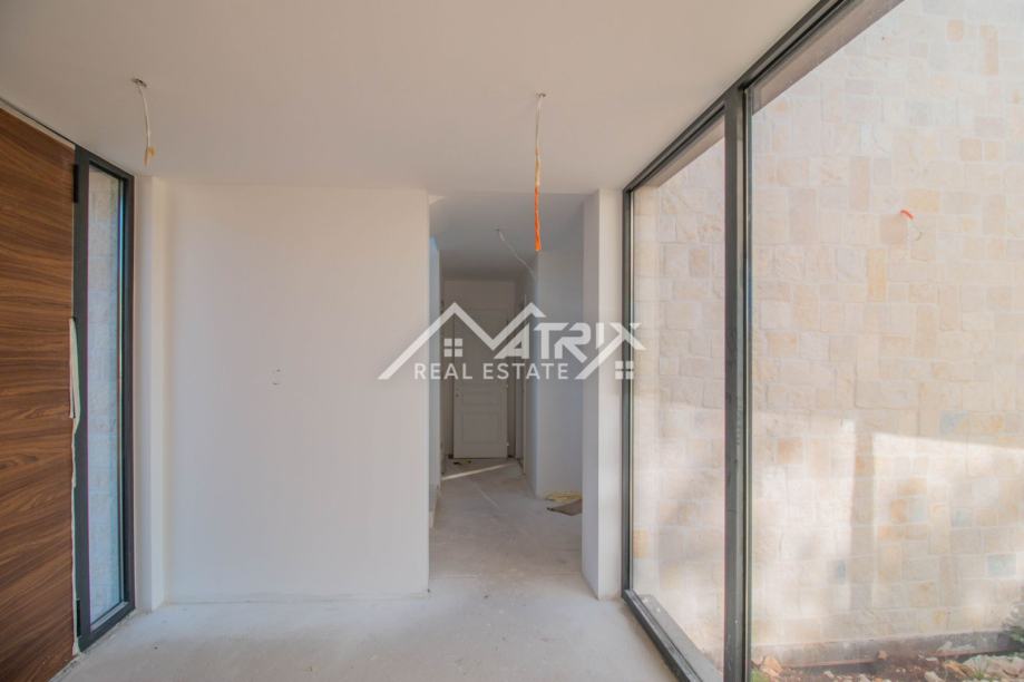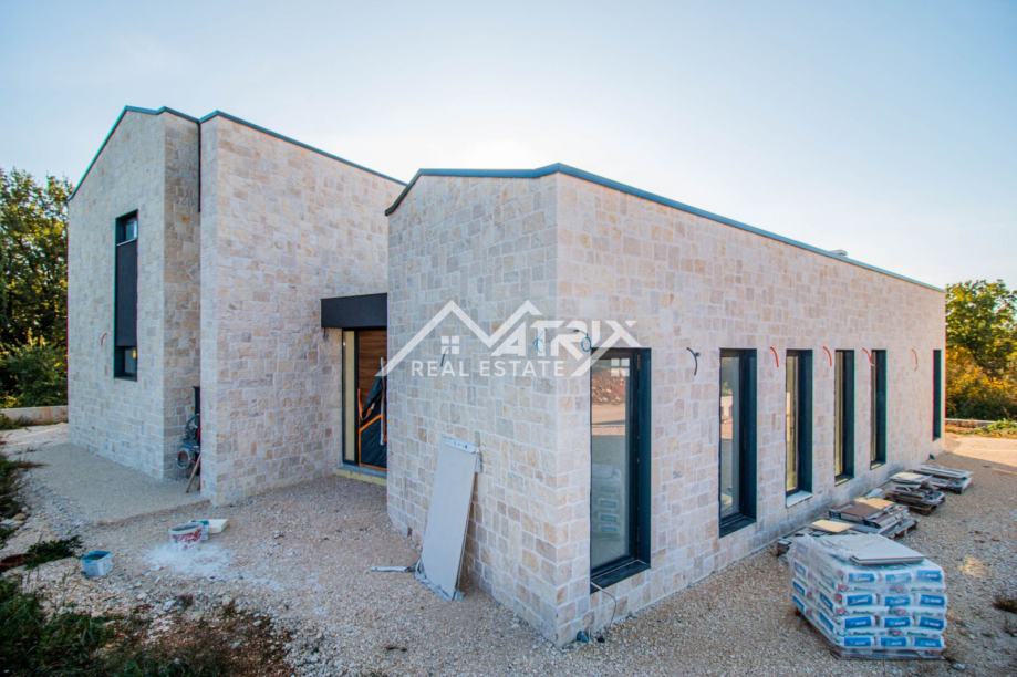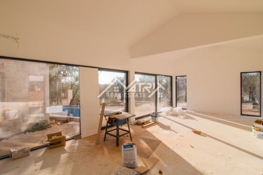 Kuća se prostire na dvije etaže, prizemlje i prvi kat. Centralni dio prizemlja je veliki prostor koji ujedinjuje dnevni boravak s blagovaonicom i kuhinjom, s izlazom na terasu bazena kroz velike staklene stijene. Uz to, u prizemlju se nalaze dvije spavaće sobe, svaka sa vlastitom kupaonicom, wc za goste sa vešerajem, te spremište sa unutarnjim i vanjskim ulazom. Velike staklene stijene pružaju obilje prirodnog svjetla i pružaju direktan izlaz na terasu bazena. Na katu se nalaze dvije spavaće sobe i dvije kupaonice.