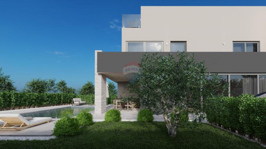 Prodaje se ova predivna moderna vila u novogradnji, smještena na udaljenost od 500 m do mora. Kuća je samostojeća, ukupne bruto površine 273 m2. U prizemlju je smješten prostrani dnevni boravak s open space kuhinjom i blagovaonom, kupatilo, vešeraj i tri ostave. Stepenicama se penje na gornji kat gdje će se nalaziti dvije velike spavaće sobe svaka sa svojim kupatilom dok se u potkrovlju nalazi još jedna spavaća s kupaonicom i izlazom na prostranu terasu s panoramskim pogledom na more. U svim će prostorijama biti postavljene velike staklene stijene koje će pružati prostoru puno svjetlosti radi svoje jugo-zapadne orijentacije, kao i lijepi pogled prema moru sa svih etaža. U dvorištu površine 850 m2 nalazit će se vanjska kuhinja, sunčalište te bazen površine 35 m2.