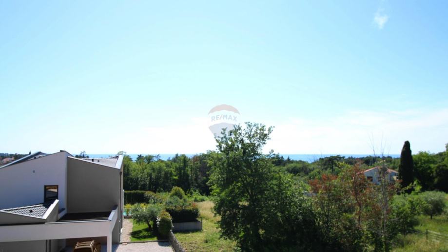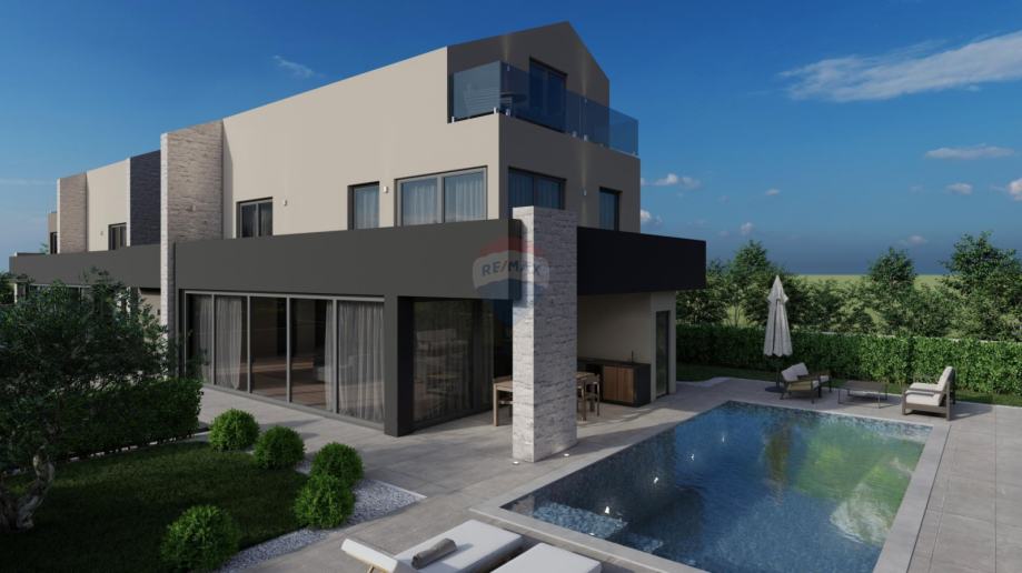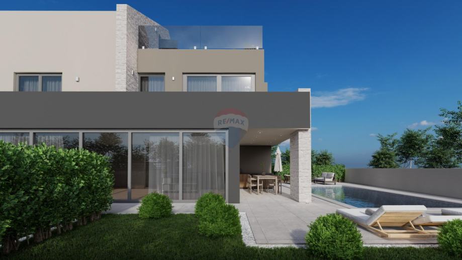 Prodaje se ova predivna moderna vila u novogradnji, smještena na udaljenost od 500 m do mora. Kuća je dvojna, ukupne bruto površine 264 m2. U prizemlju je smješten prostrani dnevni boravak s open space kuhinjom i blagovaonom, kupatilo, vešeraj i tri ostave. Stepenicama se penje na gornji kat gdje će se nalaziti dvije velike spavaće sobe svaka sa svojim kupatilom dok se u potkrovlju nalazi još jedna spavaća s kupaonicom i izlazom na prostranu terasu s panoramskim pogledom na more. U svim će prostorijama biti postavljene velike staklene stijene koje će pružati prostoru puno svjetlosti radi svoje jugo-zapadne orijentacije, kao i lijepi pogled prema moru sa svih etaža. U dvorištu površine 479m2 nalazit će se vanjska kuhinja, sunčalište te bazen površine 35 m2.