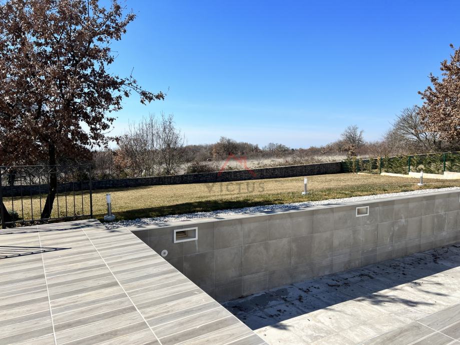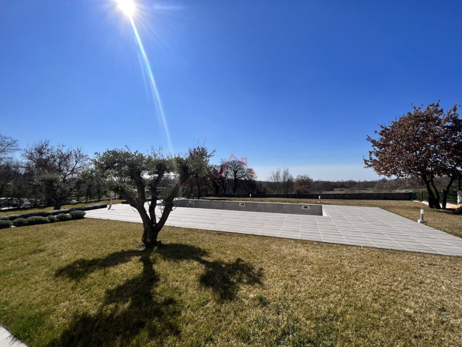 Okućnicu površine 1424m2 m2 krasi prekrasan travnjak s bazenom. Cijela parcela je ograđena kamenim zidom što osigurava dodatnu privatnost i mir.