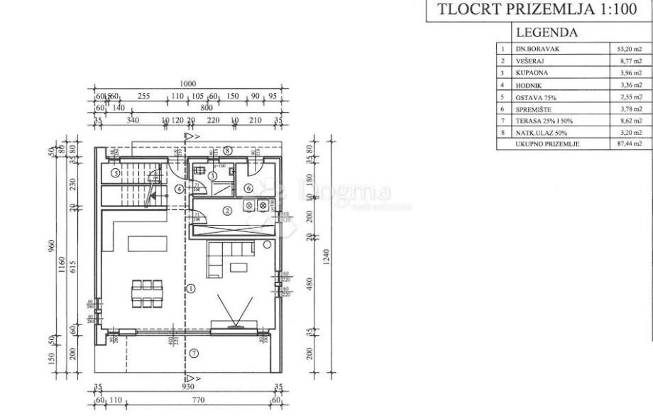 U prizemlju se nalazi prostrani open-space dnevni boravak s kuhinjom i blagovaonicom, koji se kroz velike i visoke staklene stijene otvara prema natkrivenoj terasi i vanjskom prostoru s bazenom. Takav dizajn osigurava obilje prirodne svjetlosti i stvara savršenu povezanost unutarnjih i vanjskih sadržaja. Na istoj etaži smješteni su i radna soba, gostinjski WC, ostava te tehnička prostorija za bazen s posebnim ulazom.