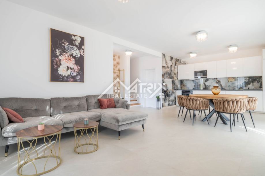 Ova prostrana kuća od 151 m² raspolaže pametno osmišljenim interijerom, koji nudi funkcionalnost i udobnost na svakom koraku. Prizemlje se sastoji od moderne, potpuno opremljene kuhinje i prostranog dnevnog boravka, koji se otvara na natkrivenu terasu i prostranu okućnicu, što stvara idealan prostor za opuštanje i druženje. Uz to, tu se nalazi i gostinjski WC, kao i praktične prostorije poput spremišta i tehničke sobe.