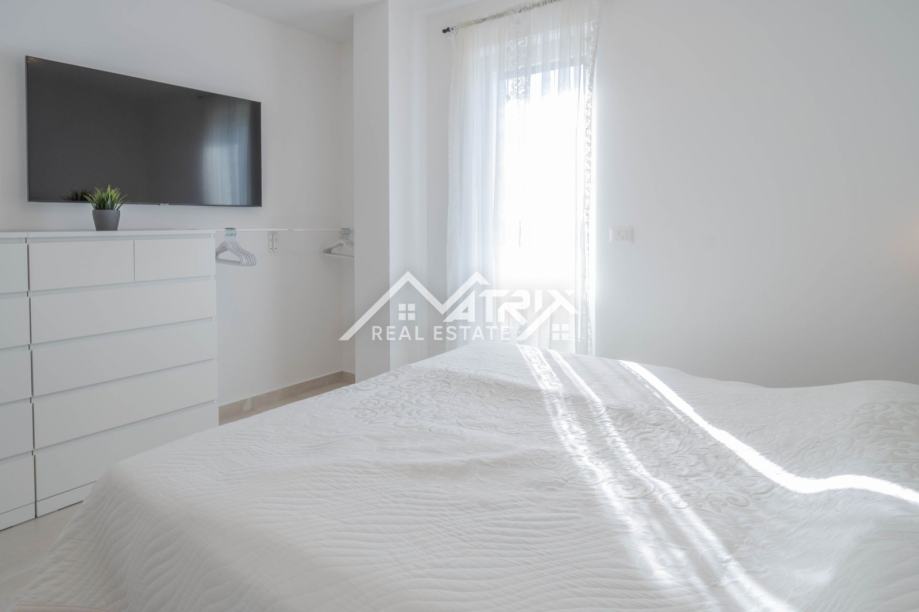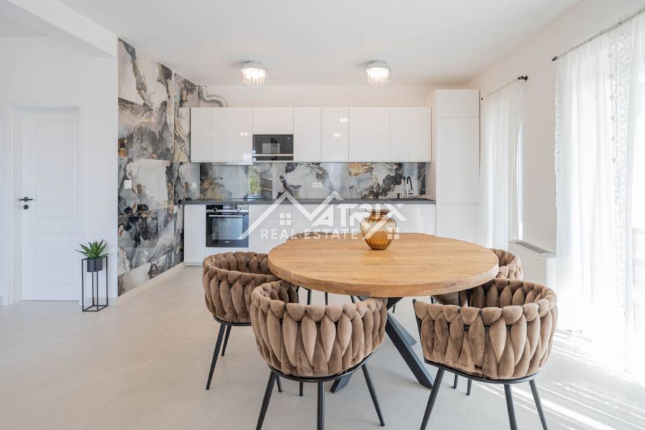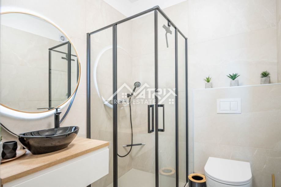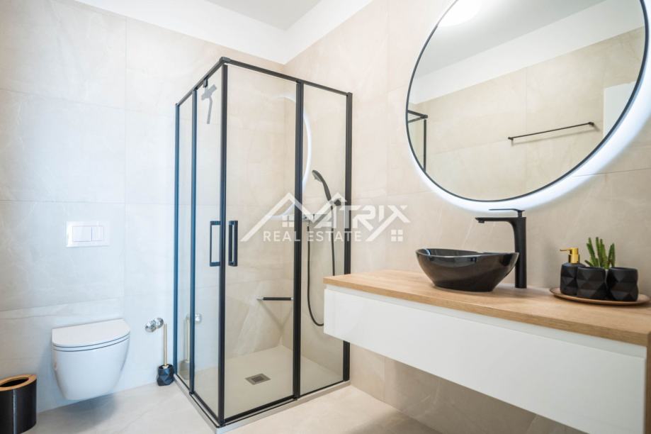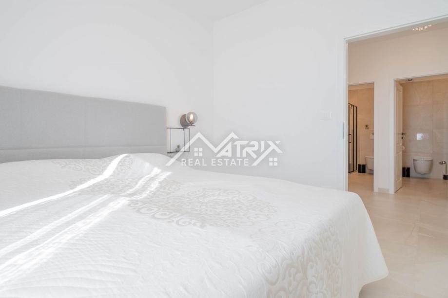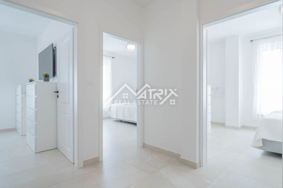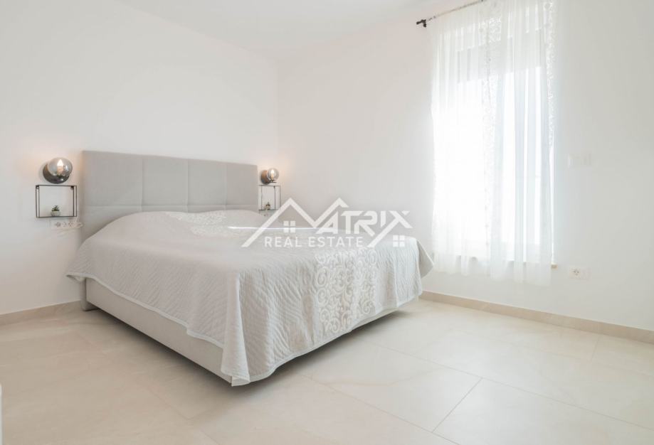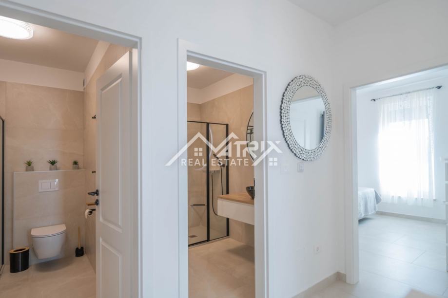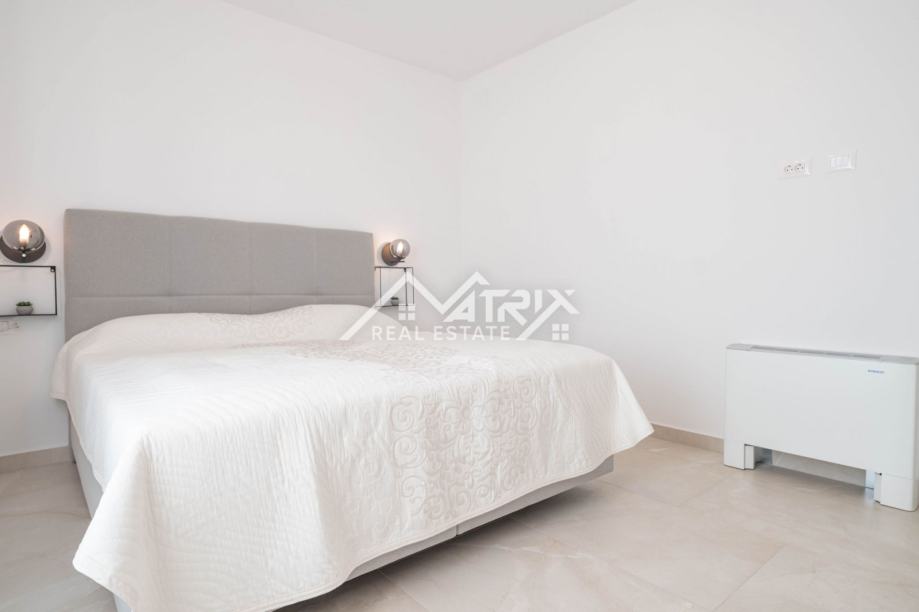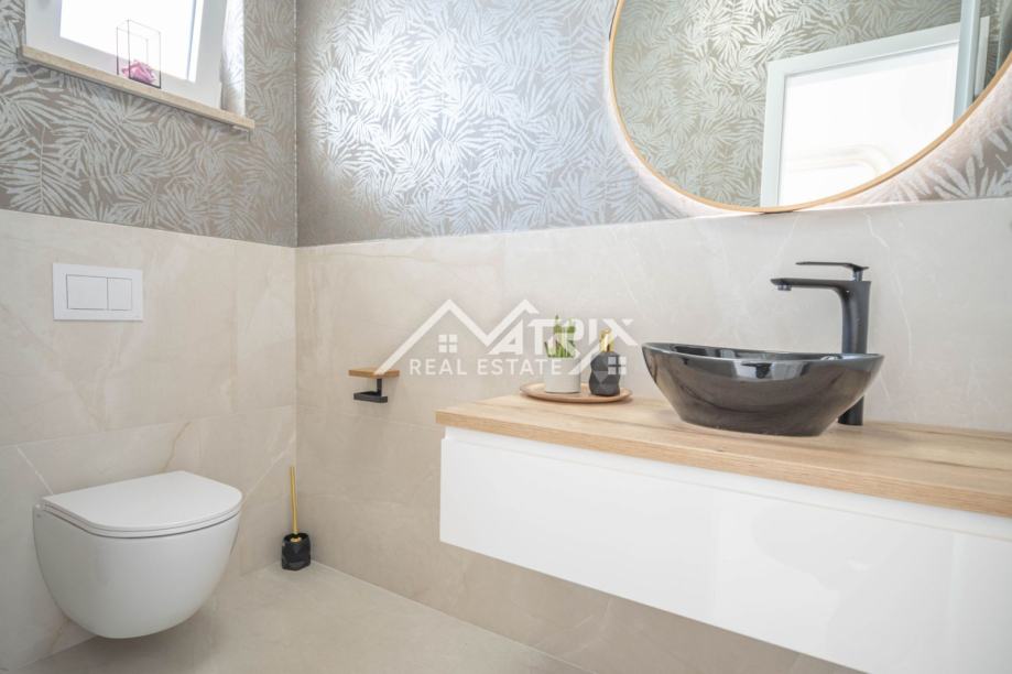 Na katu su smještene tri prostrane spavaće sobe, svaka s vlastitom kupaonicom, čime je osigurana maksimalna udobnost i privatnost za sve članove obitelji ili goste. Dodatno, sve kupaonice opremljene su podnim grijanjem, dok se cijeli prostor grije i hladi uz pomoć visokokvalitetne dizalice topline i faincoilera, što osigurava ugodnu temperaturu tijekom cijele godine.