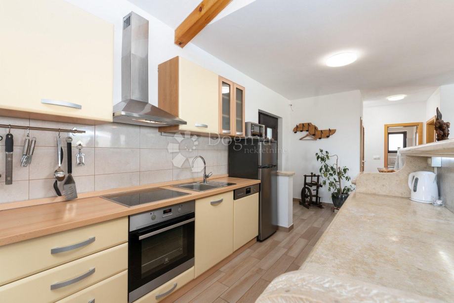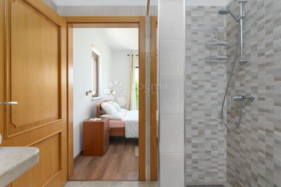 U prizemlju se nalazi ulazni hodnik, moderna kuhinja sa šankom povezana s prostranom blagovaonicom i dnevnim boravkom, u kojem toplinu doma dodatno naglašava elegantan kamin. Na istoj etaži nalazi se i ostava, gostinjski WC te jedna spavaća soba s vlastitom kupaonicom — idealna za goste ili kao glavna spavaća soba u prizemlju.