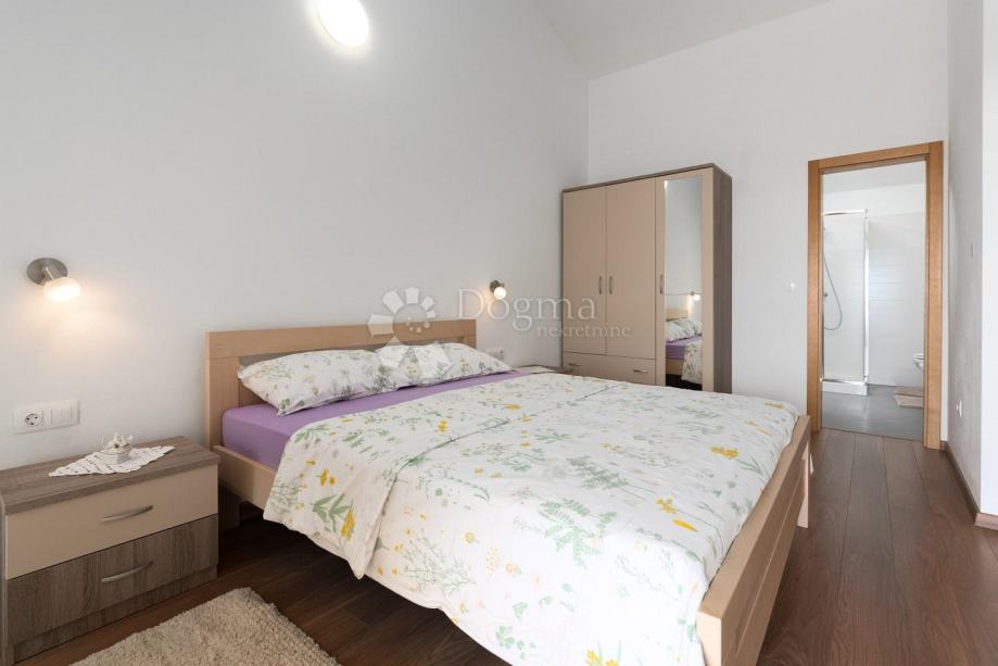 Unutarnje stubište vodi na kat, gdje su smještene dvije prozračne spavaće sobe, svaka sa svojom privatnom kupaonicom. Obje sobe imaju pristup velikoj natkrivenoj terasi s koje se pruža predivan pogled na more i okolnu prirodu, savršen za jutarnju kavu ili večernje opuštanje.