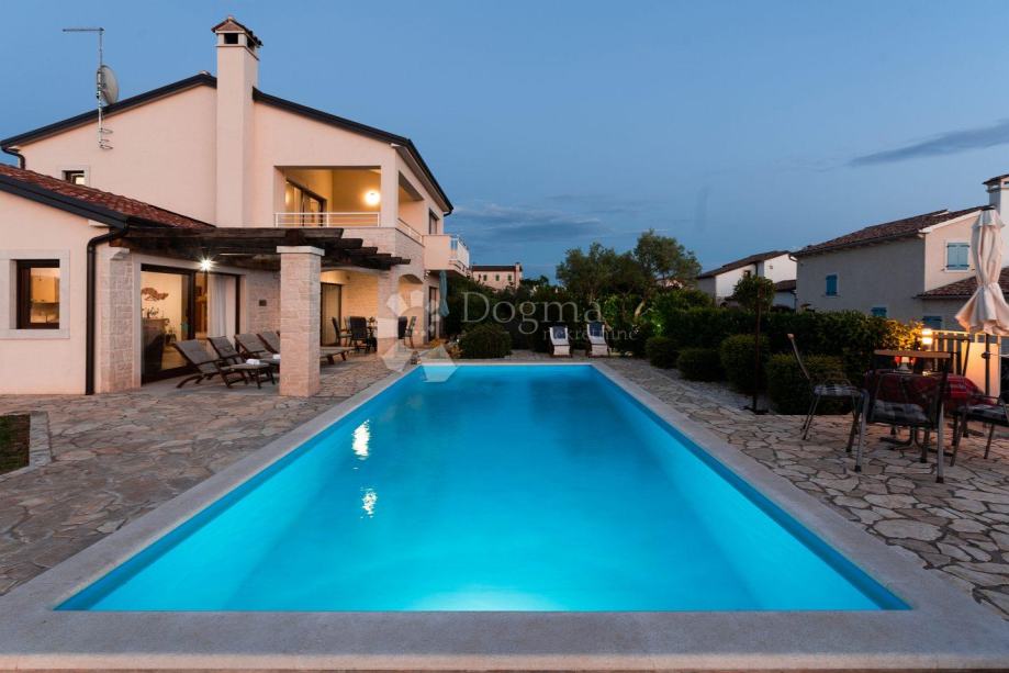U vanjskom dijelu okućnice nalazi se bazen površine 36 m², sunčalište s ležaljkama, djelomično natkrivena terasa sa sjedećom garniturom te roštilj — savršen prostor za uživanje na otvorenom tijekom cijele godine. Uz to, vila raspolaže i ljetnom kuhinjom, lijepo uređenim vrtom te dva privatna parkirna mjesta.