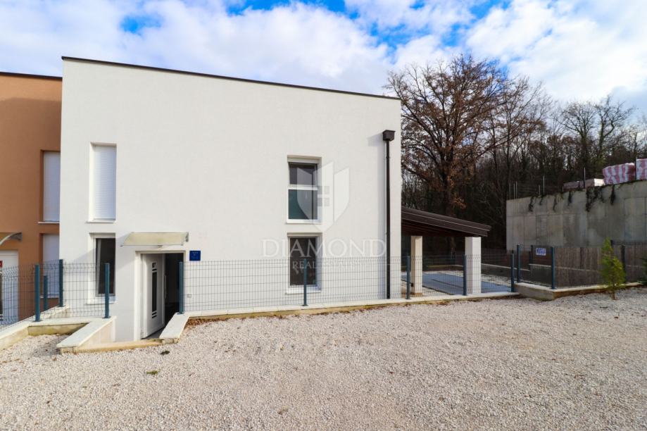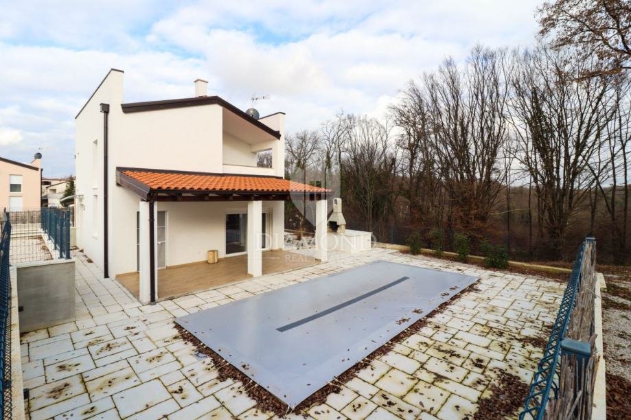 Kuća prostire na dvije etaže. U prizemlju se nalazi prostrani dnevni boravak, kuhinja i blagovaona po open space konceptu, jedna kupaona i ostava. Drvenim se stubištem penjemo na prvi kat gdje se nalaze dvije spavaće sobe, kupaona i vešeraj. Kroz dnevni boravak izlazimo na natkrivenu terasu sa sunčalištem i bazenom. Terasa omogućuju ugodne trenutke na svježem zraku, bilo za opuštanje ili druženje.