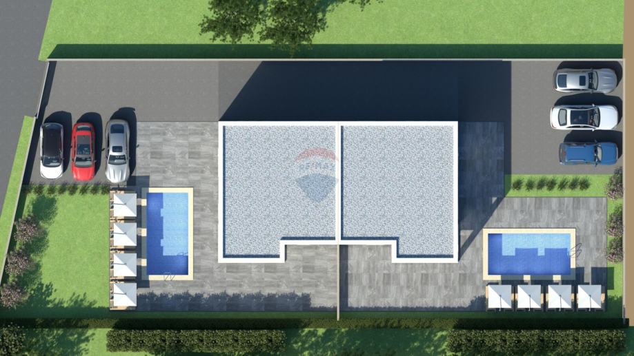 U prizemlju se nalazi ulazni prostor, utility room, gostinjski wc, kupaonica, jedna spavaća soba, kuhinja sa blagovaonom i dnevnim boravkom u open space konceptu. Iz dnevnog boravka i kuhinje je omogućen izlaz na natkrivenu terasu te sunčalište i bazen.