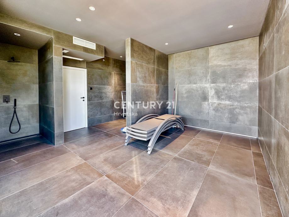 Prizemlje sadrži impresivan, otvoreni dnevni boravak od približno 60 m2 s kuhinjom, blagovaonicom i dnevnim boravkom – okupanim prirodnim svjetlom i s direktnim pristupom sunčanim terasama i natkrivenoj ljetnoj kuhinji. Tu je i wellness zona s pristupom bazenu, WC za goste, ostava i velika pomoćna prostorija.