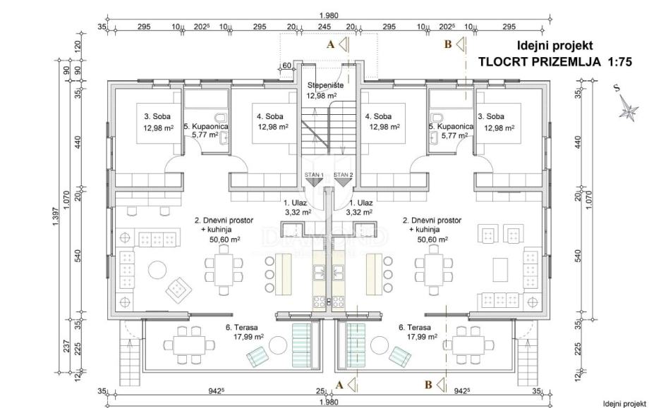 Biti će dva stana u prizemlju i dva na prvom katu. Ukupna veličina stana će biti 106.64.
