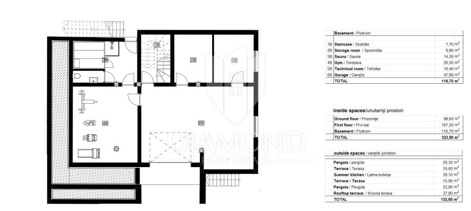 Vila prostire na tri etaže. U podrumu će se nalaziti fitnes, sauna, tehnička soba, spremište i zasebno garaža za automobile.