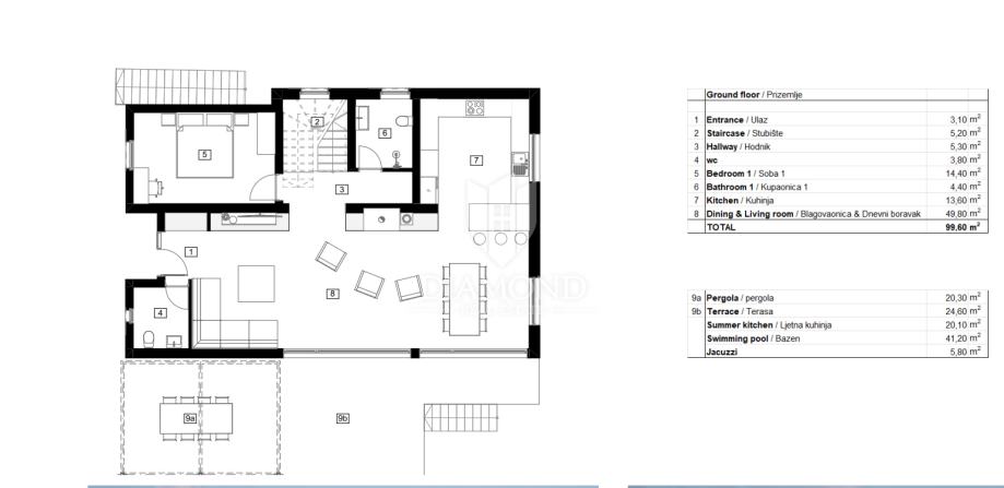Vrt ispred kuće biti će zasađen i uređen mediteranskim biljem, a centralno mjesto u vrtu zauzima veliki bazen sa sunčalištem koji omogućuje potpuni užitak u vrelim ljetnim danima. U dvorištu se još nalazi ljetna kuhinja.