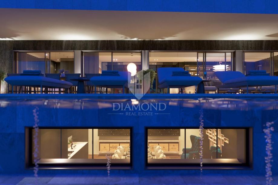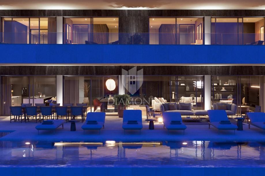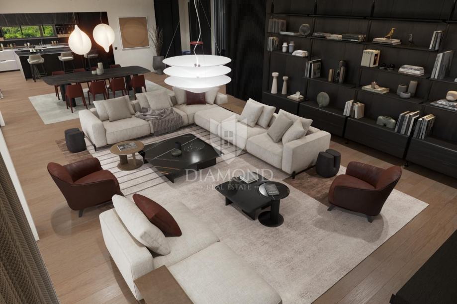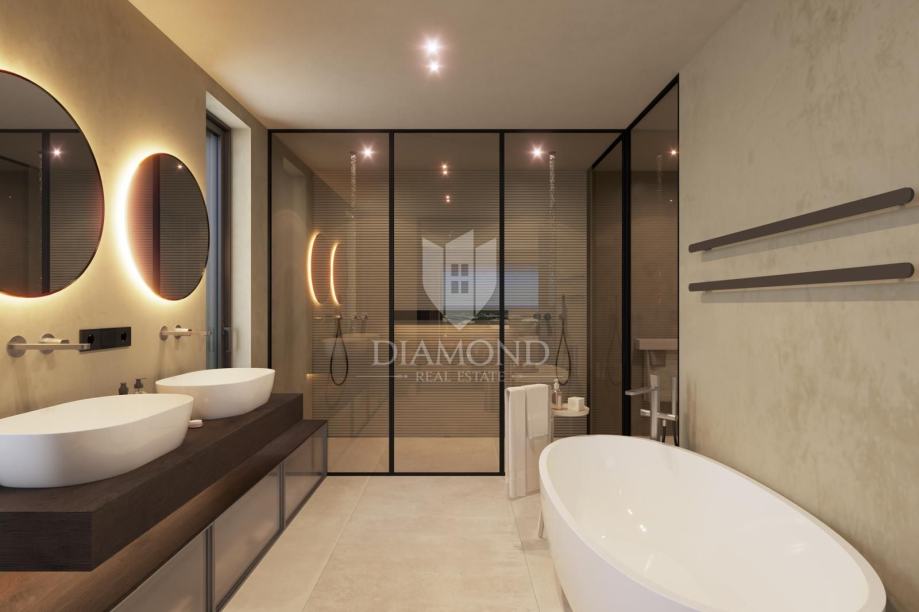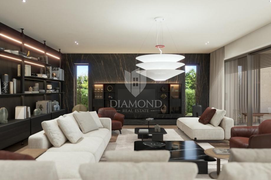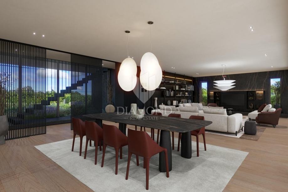 Prizemlje obuhvaća elegantan ulazni prostor, gostinjski WC, garderobu, kuhinju s ostavom, blagovaonicu i dnevni boravak koji izlazi na natkrivenu terasu s preljevnim bazenom.