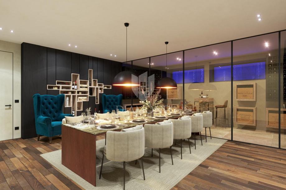 Na ukopanoj etaži nalazi se prostrana garaža s tri parkirna mjesta, tehničke prostorije, wellness oaza te vinski podrum za druženje.
