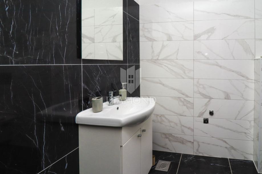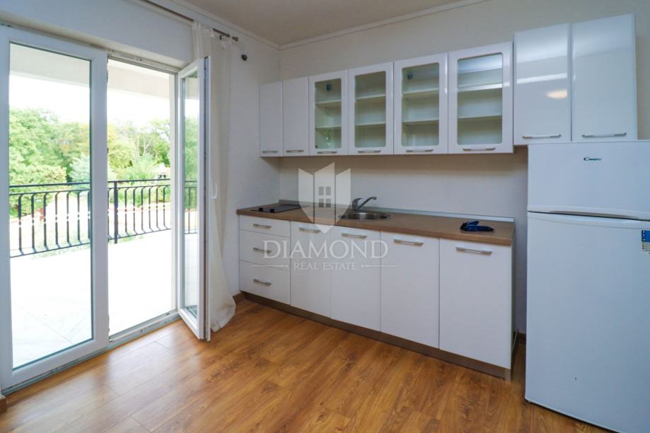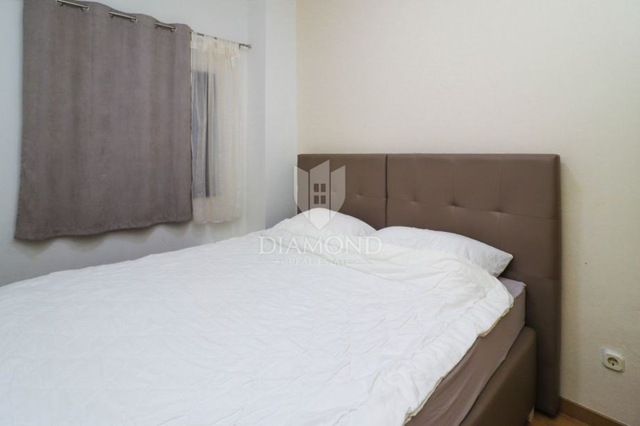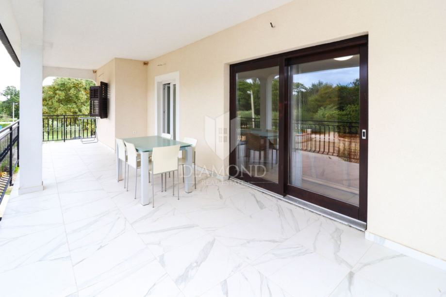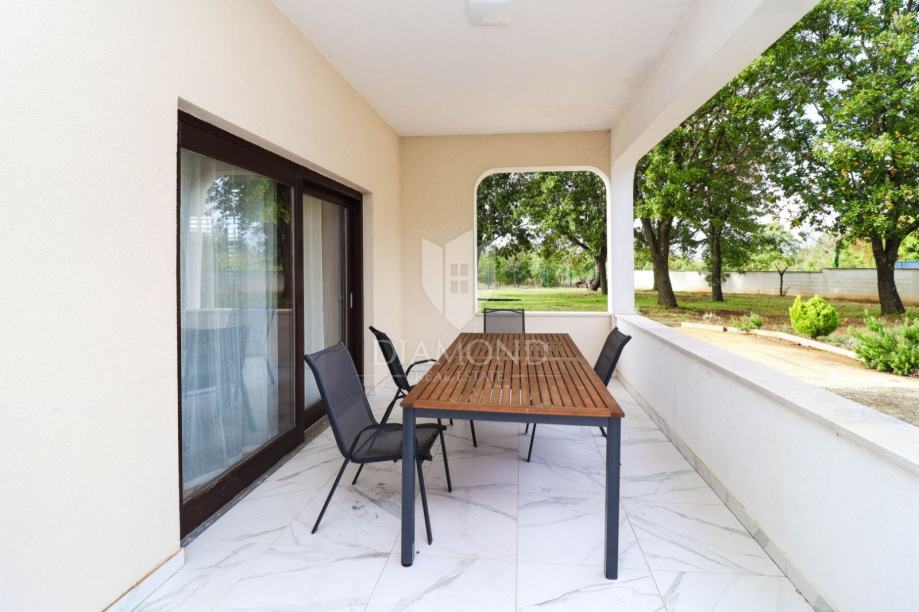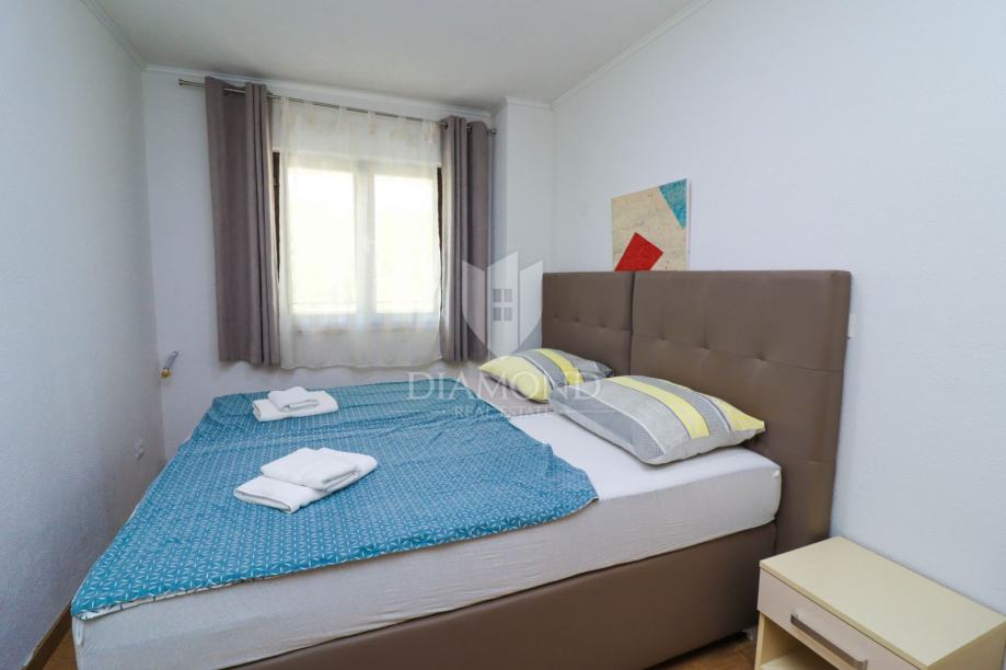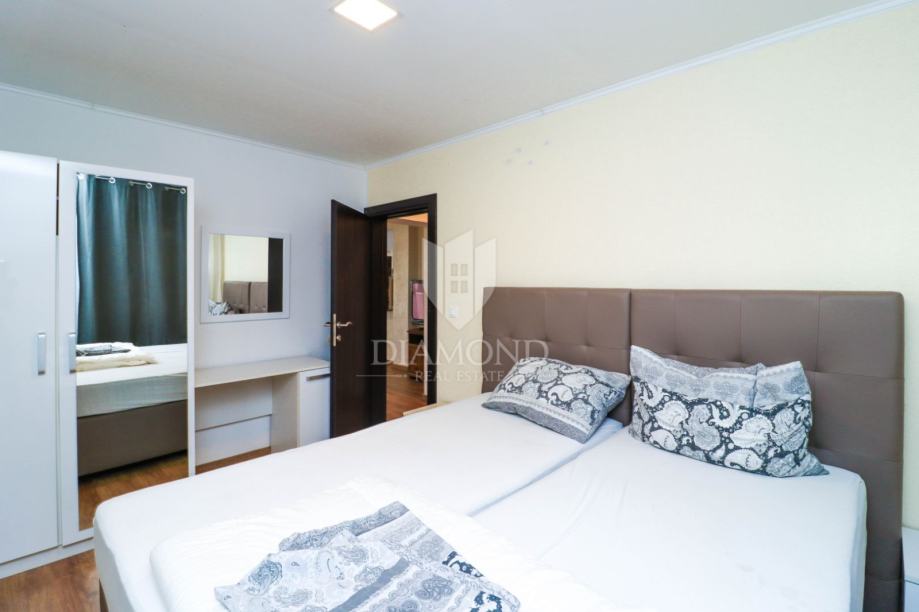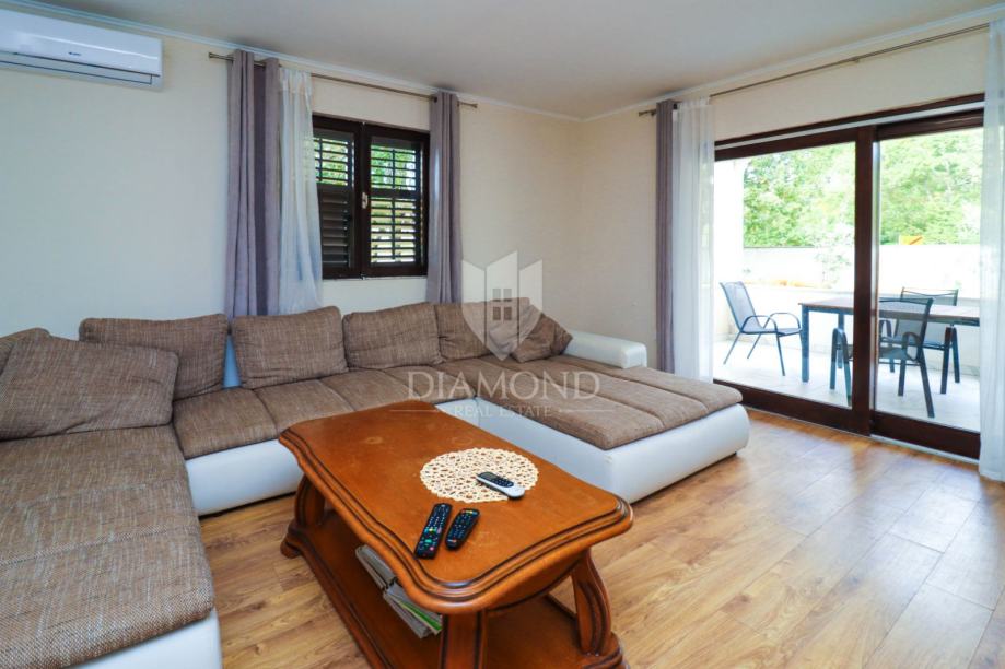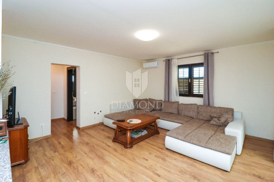 Apartman u prizemlju se sastoji od dnevnog boravka, kuhinje, blagovaone, kupaone i dvije spavaće sobe od kojih jedna ima izlaz na sunčalište sa bazenom.