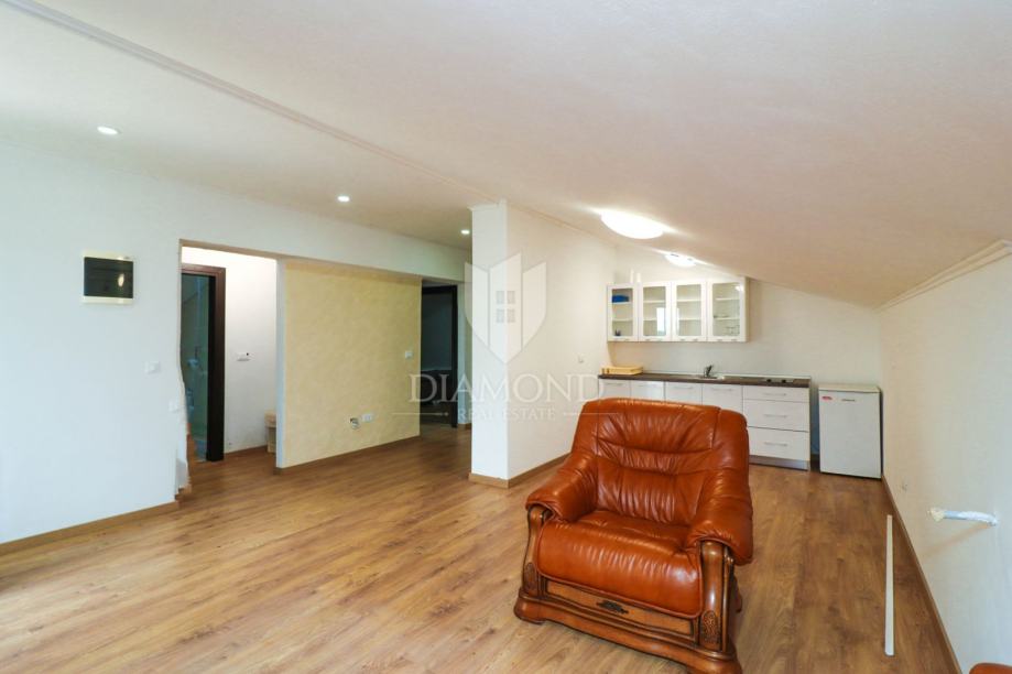 Vanjskim stubištem se penjemo na prvi kat gdje se nalazi prostrani dnevni boravak, blagovaona i kuhinja sa izlazom na komotnu terasu, tri spavaće sobe i jedna kupaona.