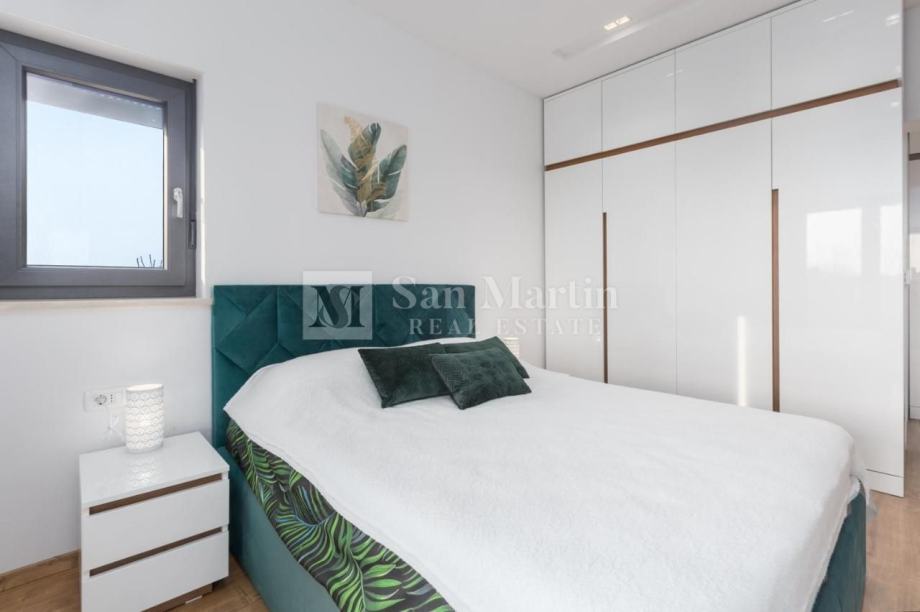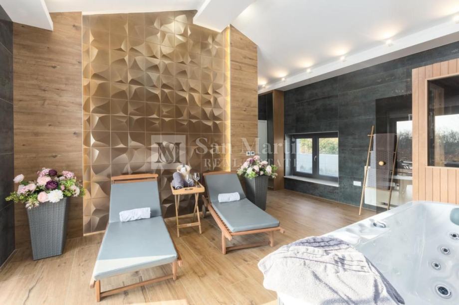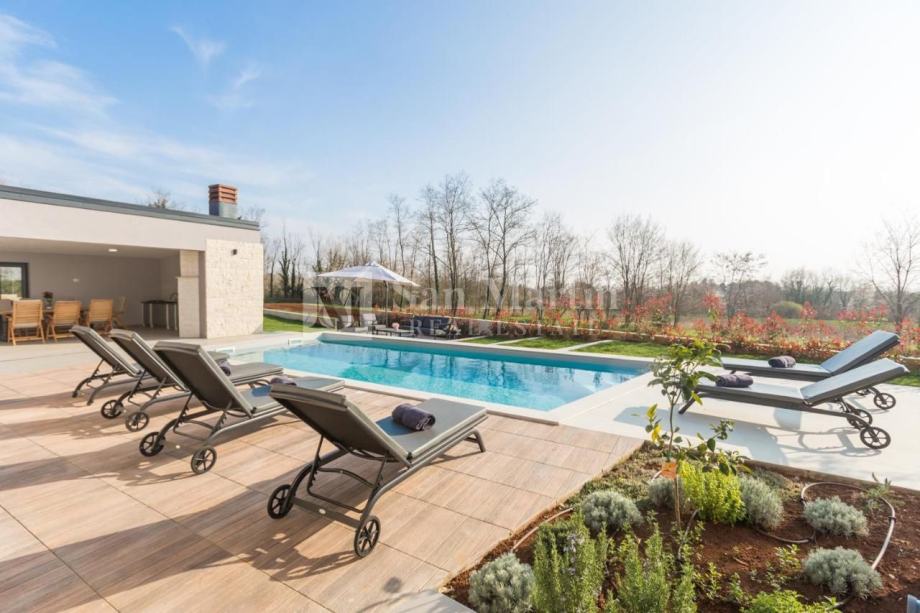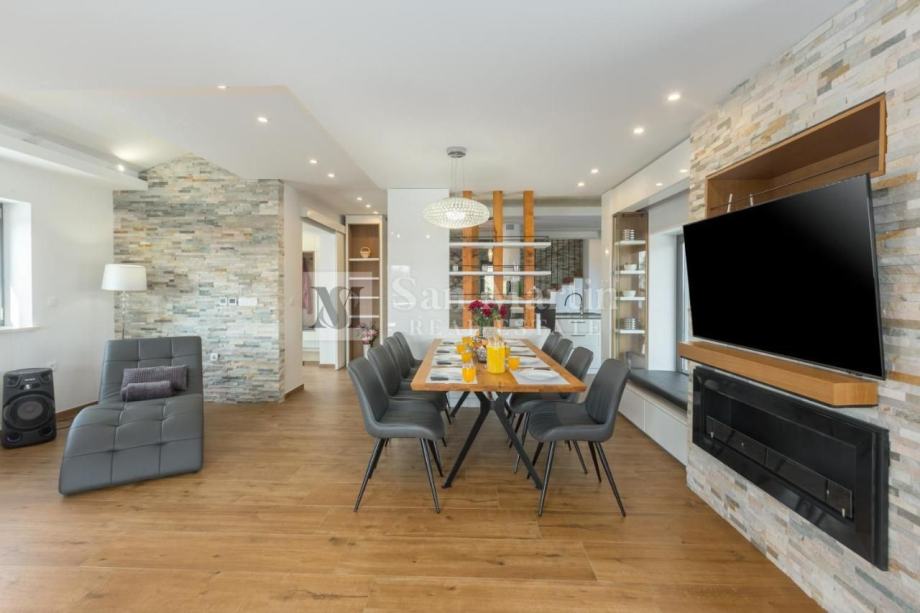 Dnevni prostor ove prekrasne nekretnine ima izlaz na natkrivenu terasu koja vodi u vrt u kojem su smješteni bazen sa slanom vodom, ljetna kuhinja te dječje igralište.