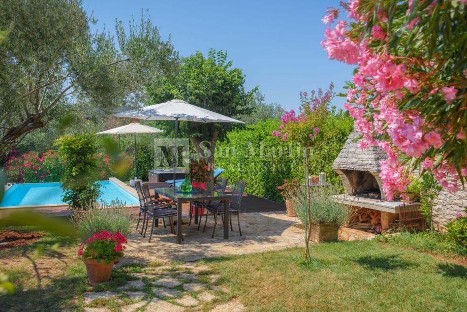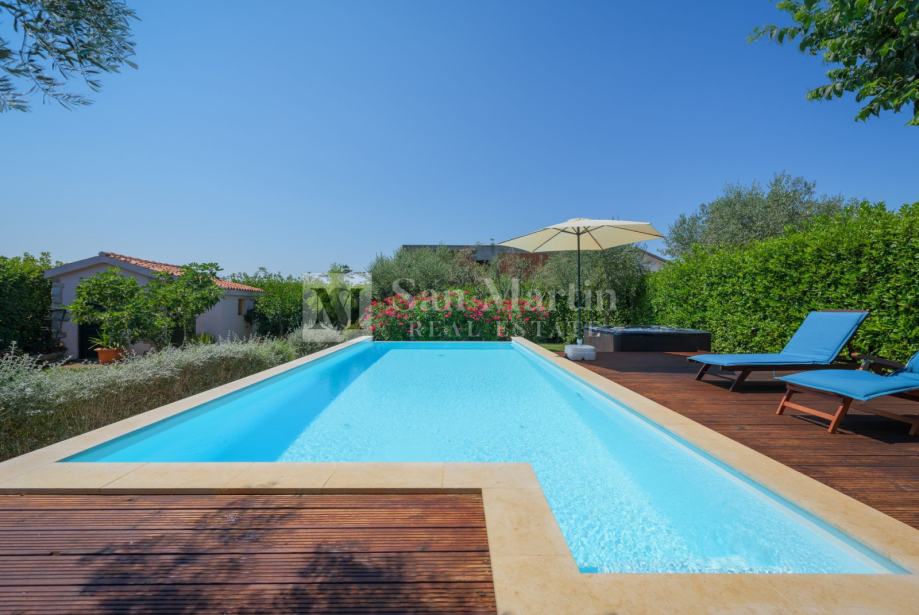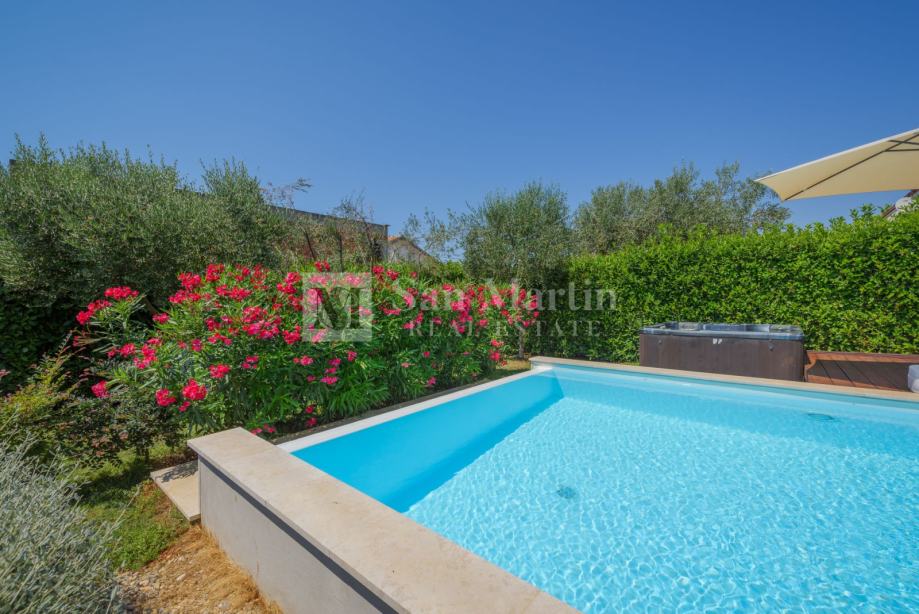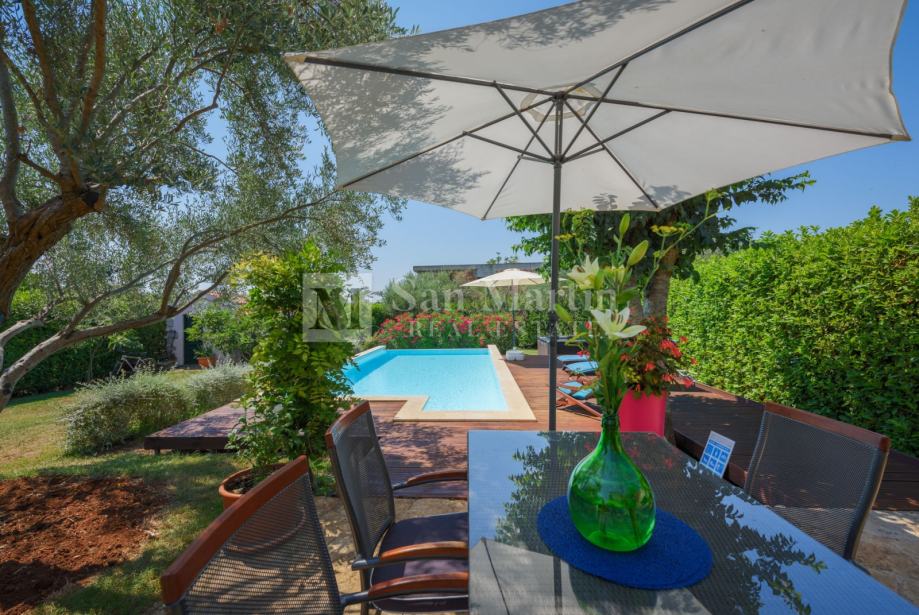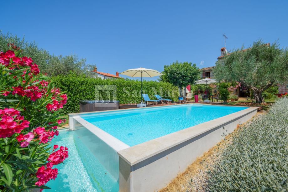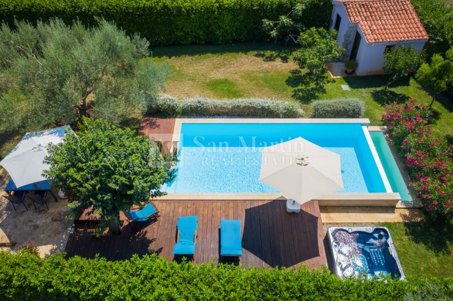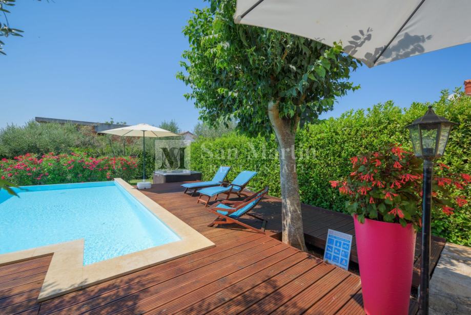 Nekretnina ima lijepu natkrivenu terasu te prekrasni uređeni vrt s bazenom i jacuzzi.