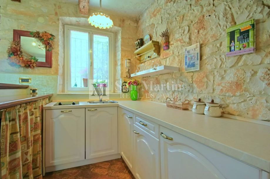 U mirnom mjestu, nedaleko od mora i grada na lijepo uređenoj okućnici od 516 m2 smjestila se kamena ljepotica ukupne površine 150 m2. Kuća se prostire na tri etaže. U prizemlju su se smjestili dnevni boravak, kuhinja, blagovaona te jedna kupaona. Dvije spavaće sobe se protežu na prvom i drugom katu.